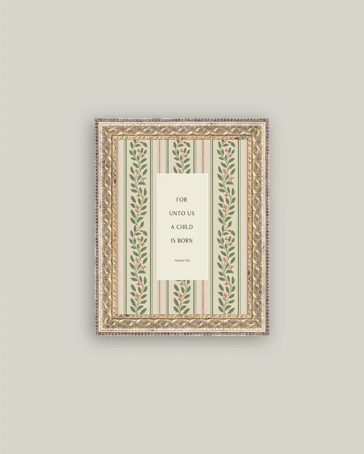 Add a nostalgic touch to your Christmas decor with this gold framed quote with Mistletoe / berry stripe background. This artwork is printed on canvas and framed in a vintage inspired frame for an elegant touch to your holiday decor.