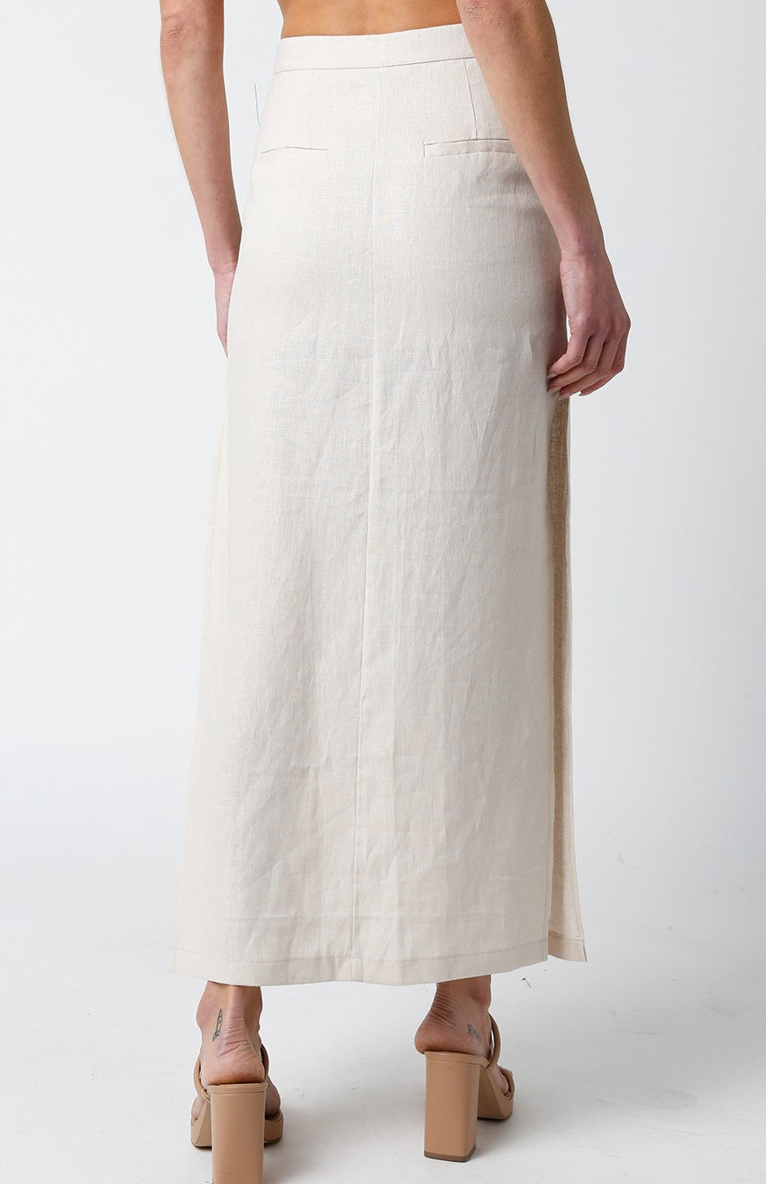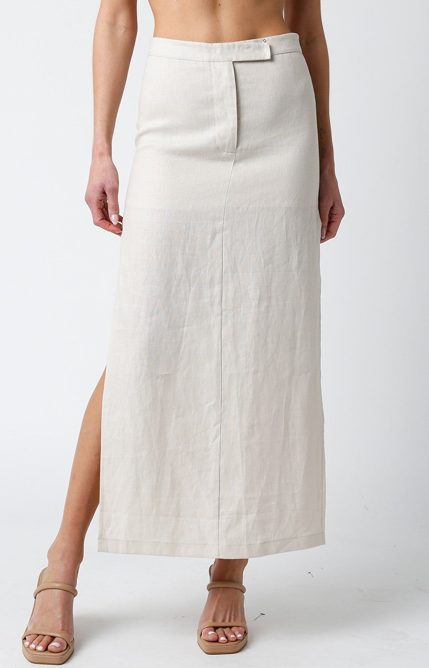 Our Abigail Midi Skirt features a lightweight linen material with side slit and mid length hemline.