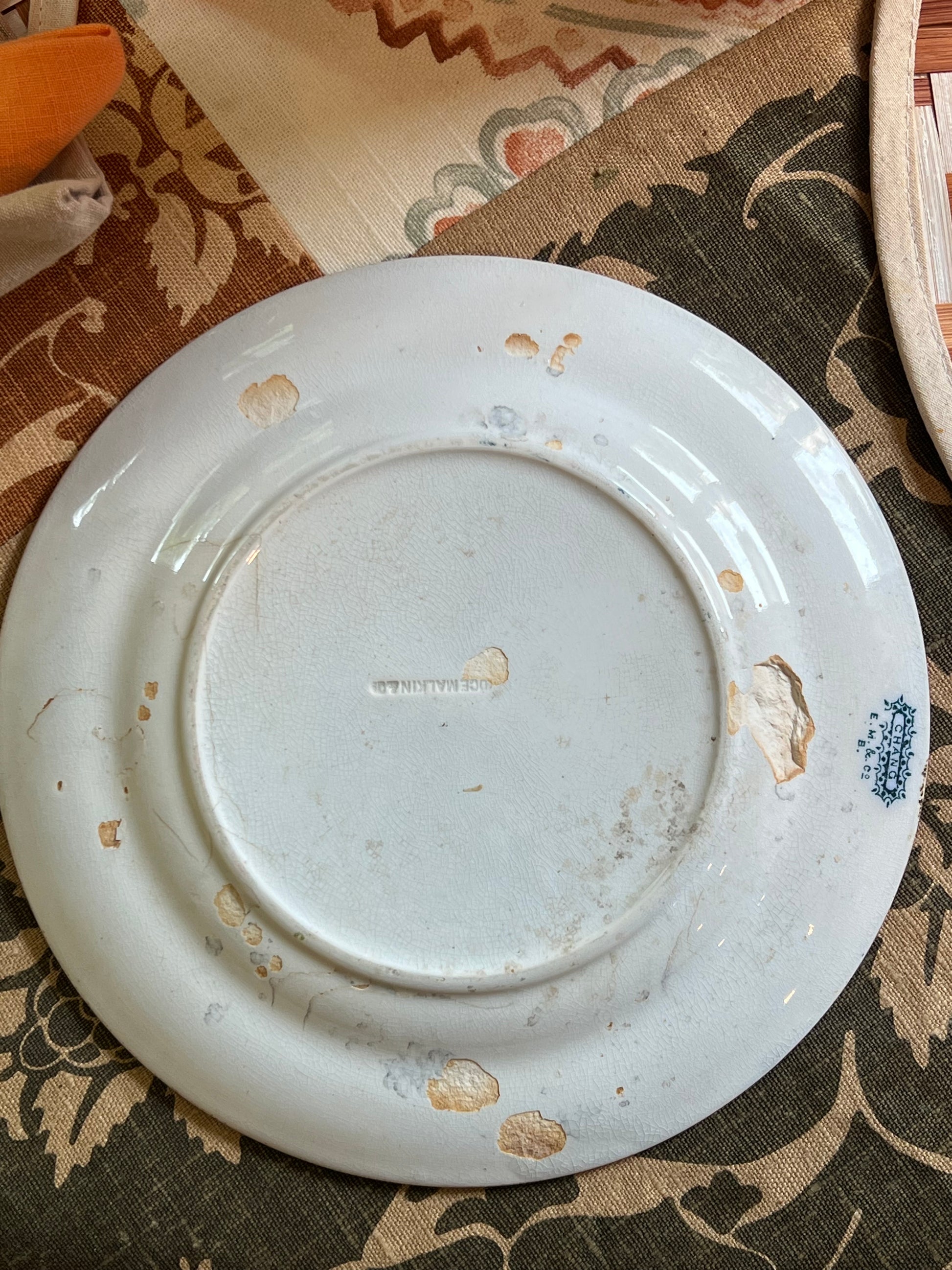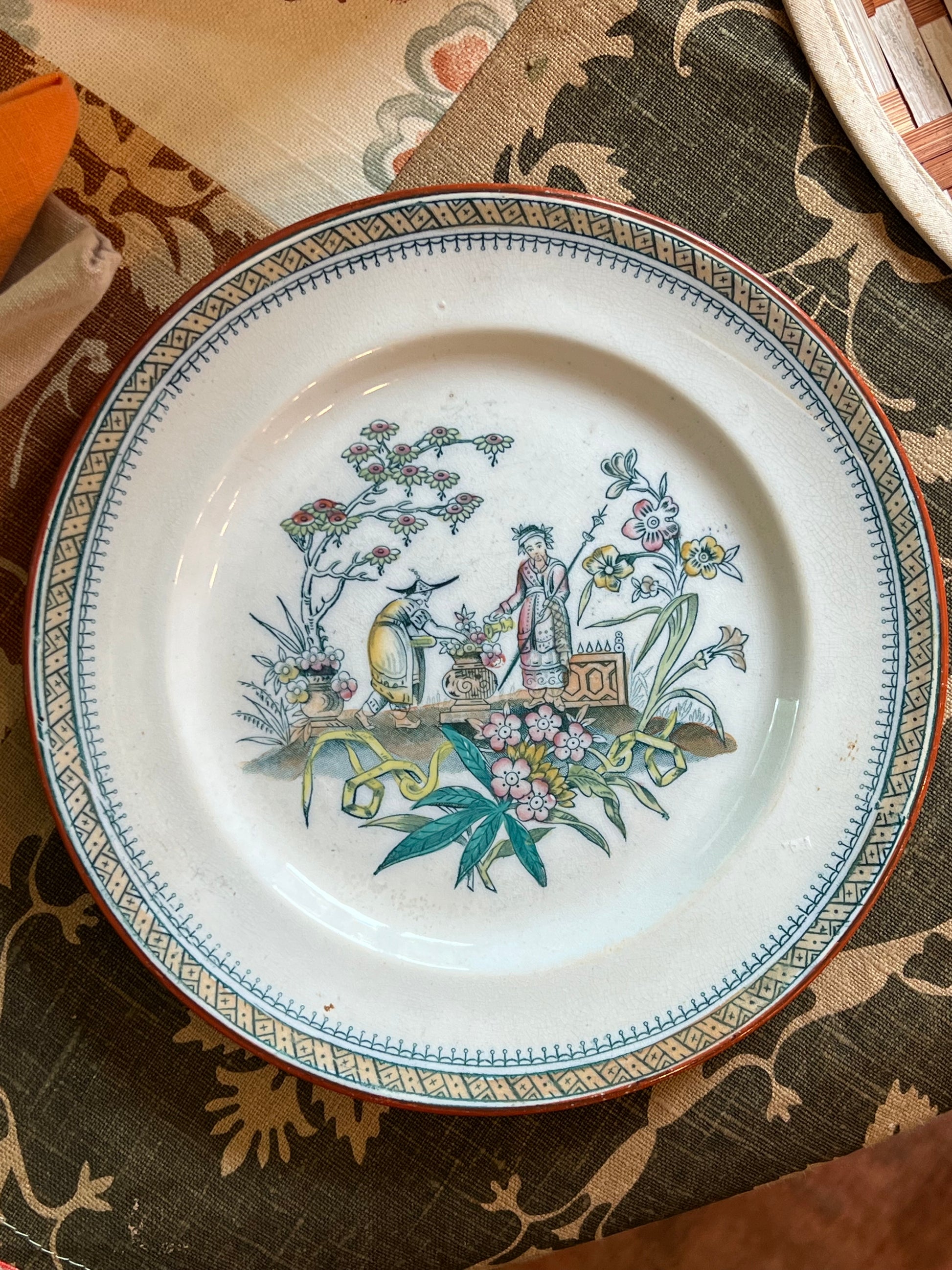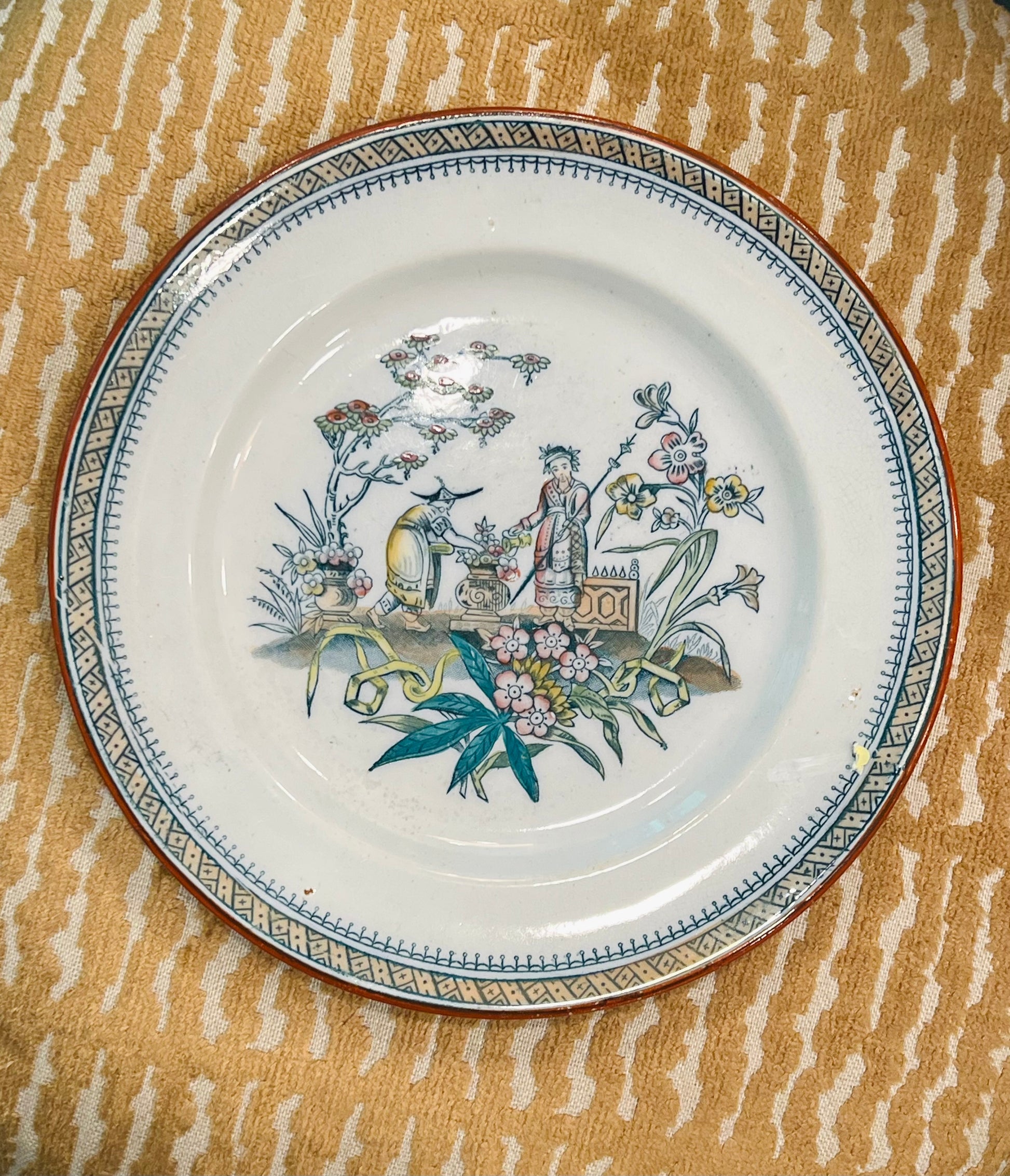 - Features: Polychrome transferware against a dark cream background, with a dark tan band and green designs surrounding the rim, and a terra cotta/reddish color on the edge.