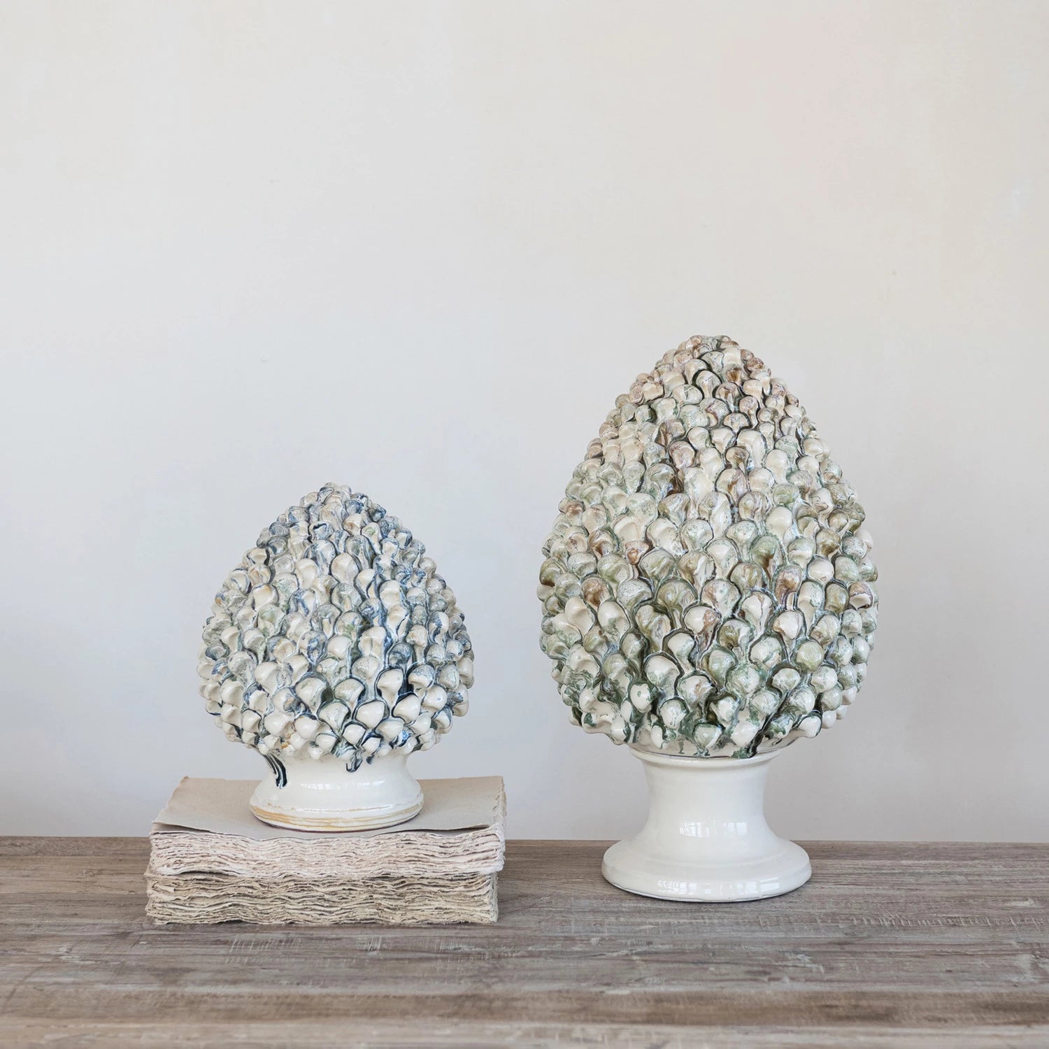 Beautiful terra-cotta artichoke finial with a reactive glaze. This ornate piece has a cream base with blue and green layers. Each one Varies.