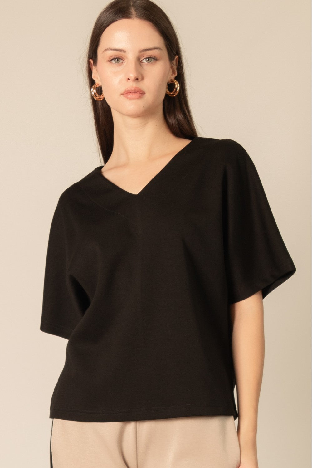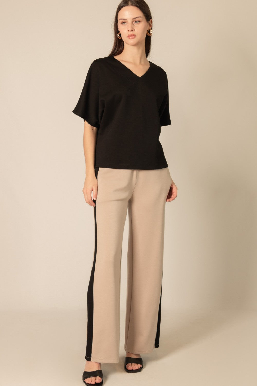 Part of our favorite lounge wear collection. This top is a refined staple designed for everyday ease. This top pairs well with our taupe side stripe lounge pants. Made with butter modal fabrication, it features a flattering v-neckline, and relaxed fit.