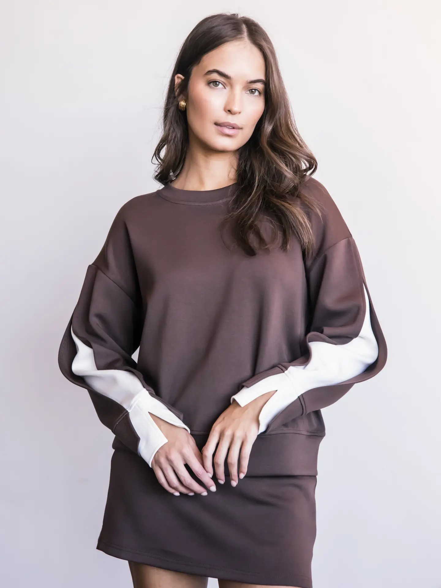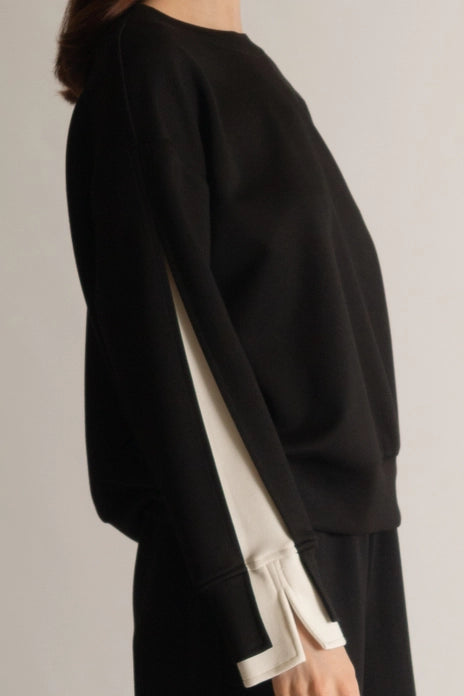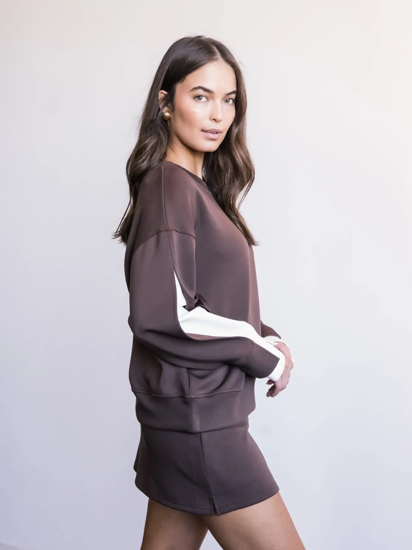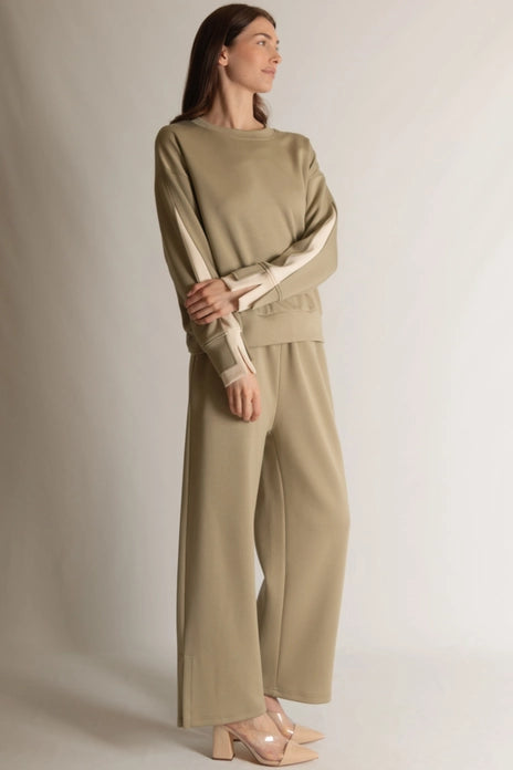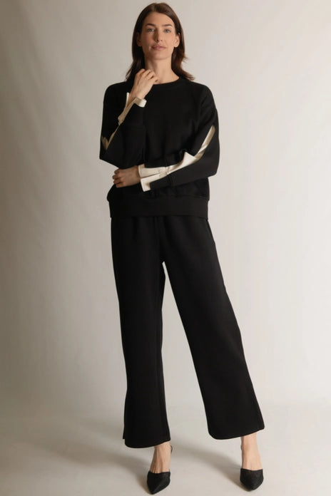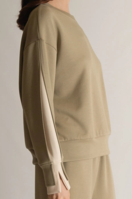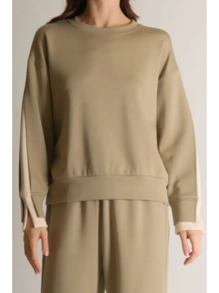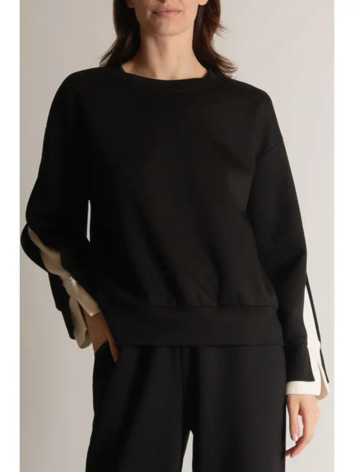 Part of our Butter Soft collection. This casual top is slightly elevated with a layered stripe inlay along the sleeve. Perfect for work but comfortable enough for lounge wear.