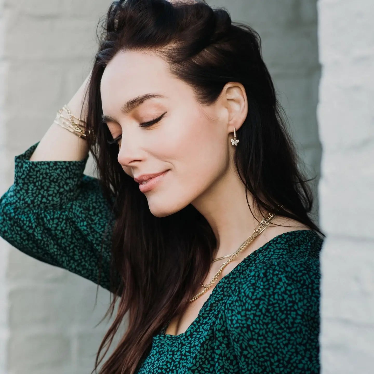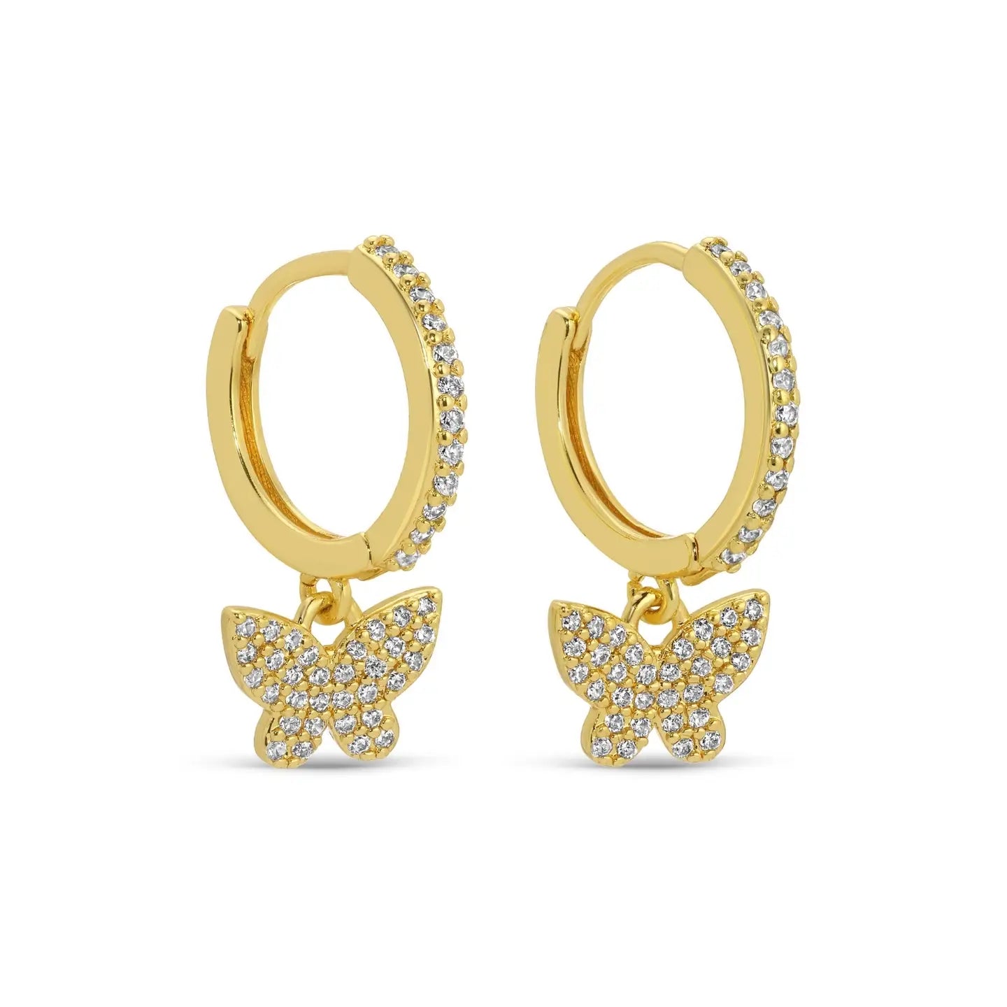 Add a touch of elegance and whimsy to your style with these pavé huggies, featuring delicately pavé stones. A shimmering butterfly motif, adorned with matching pavé detailing, gracefully enhances these sleek and versatile huggie drop earrings.