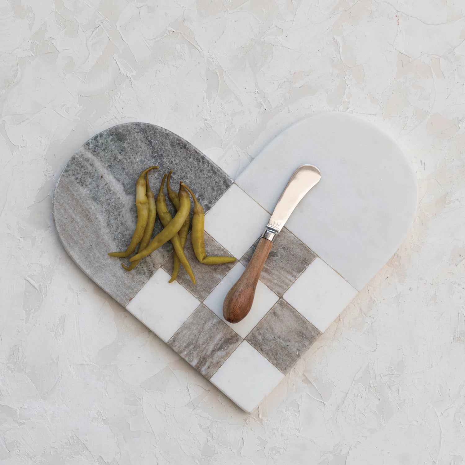 The perfect gift for Valentines Day! This unique two tone marble board can be used as a cutting board, cheese board, or as decor in your kitchen. Comes with Canape Knife.