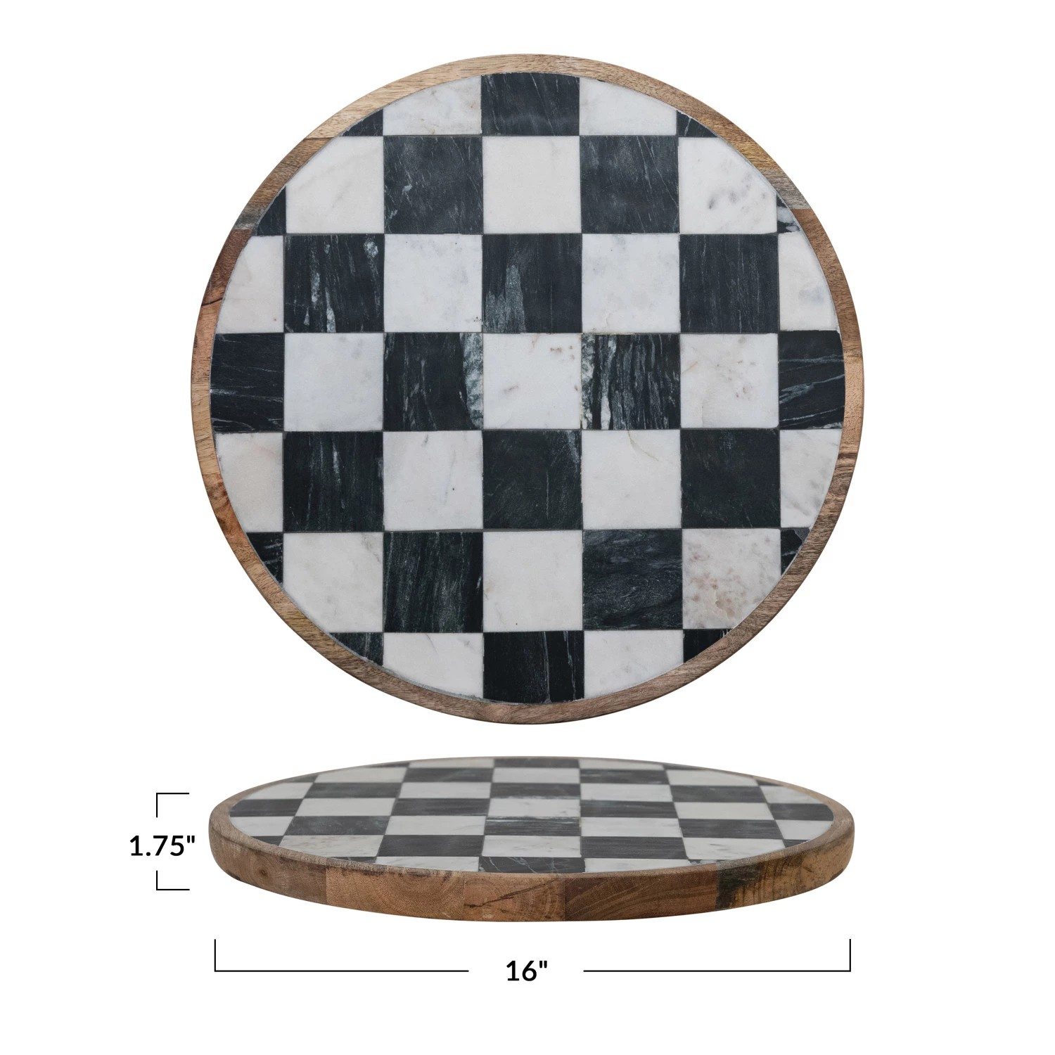 Mango Wood & Marble Check Lazy Susan, White, Black & Natural (Each One Will Vary)
