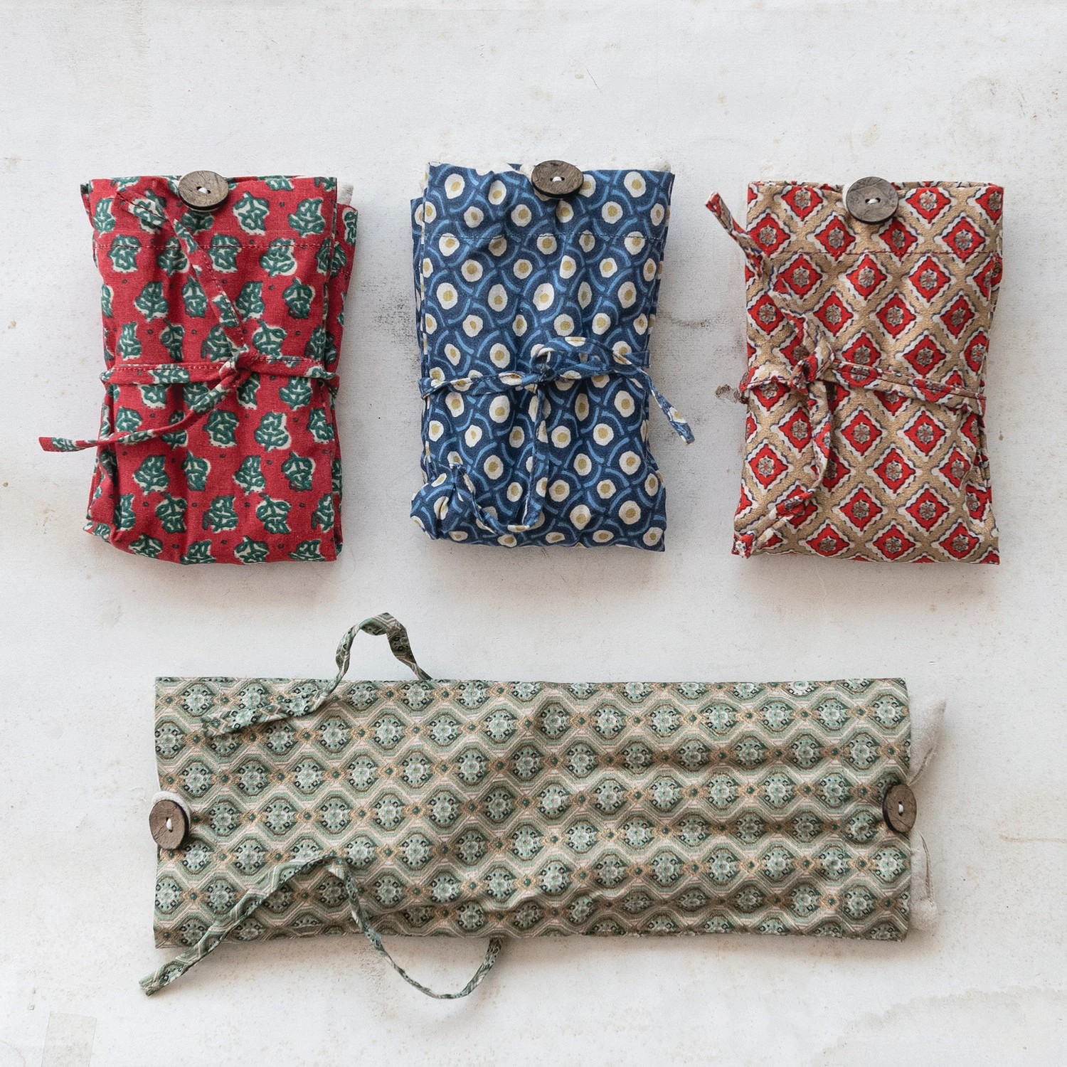 Microwaveable Hot/Cold Pack with Coconut Shell Buttons & Cotton Printed Cover Filled w/ Natural Lentils & Lavender Tied w/ Printed Cotton Tape, Multi Color.