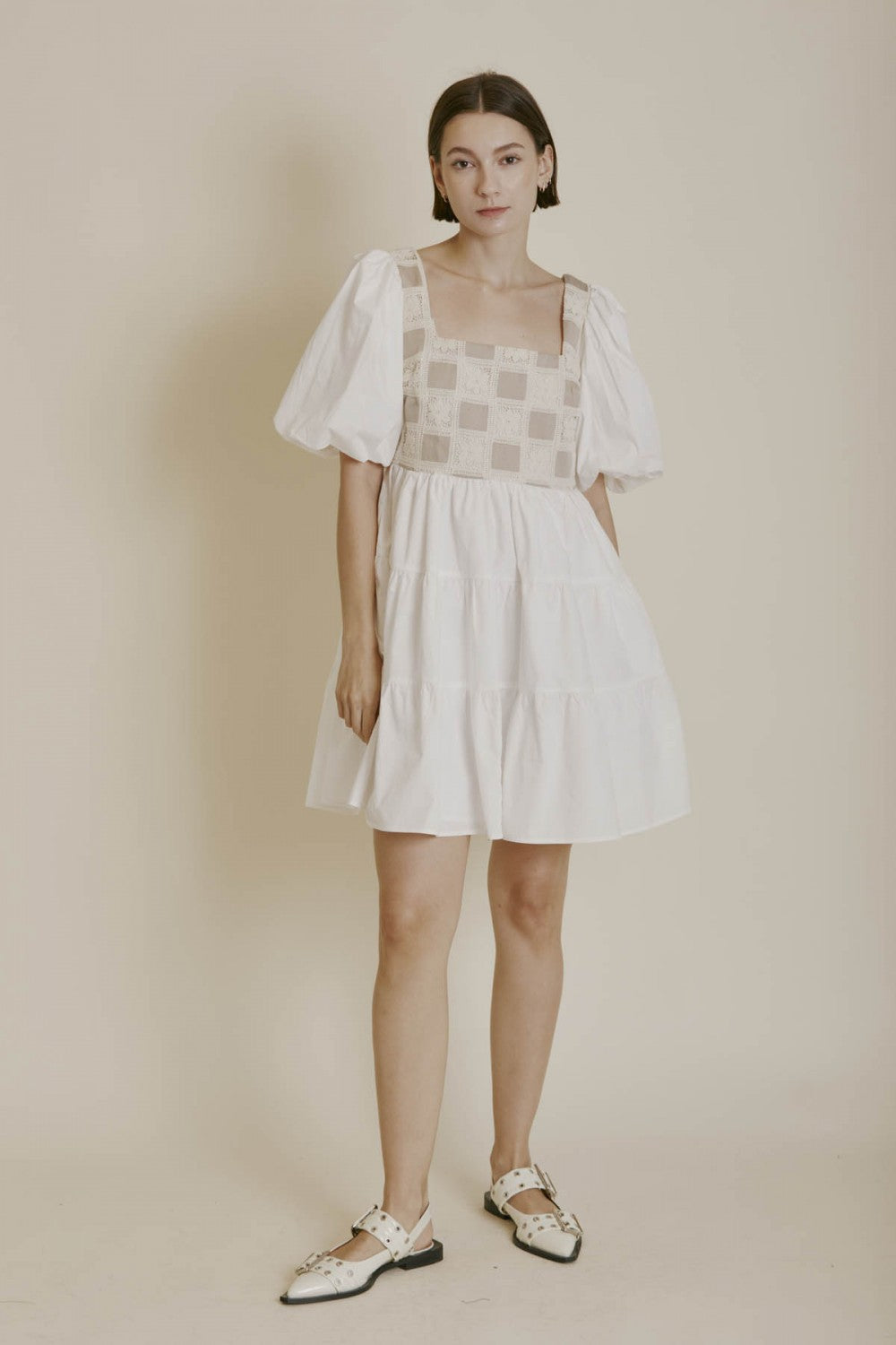 This is the perfect summer dress with its feminine silhouette, crochet accent, and soft white fabric.
