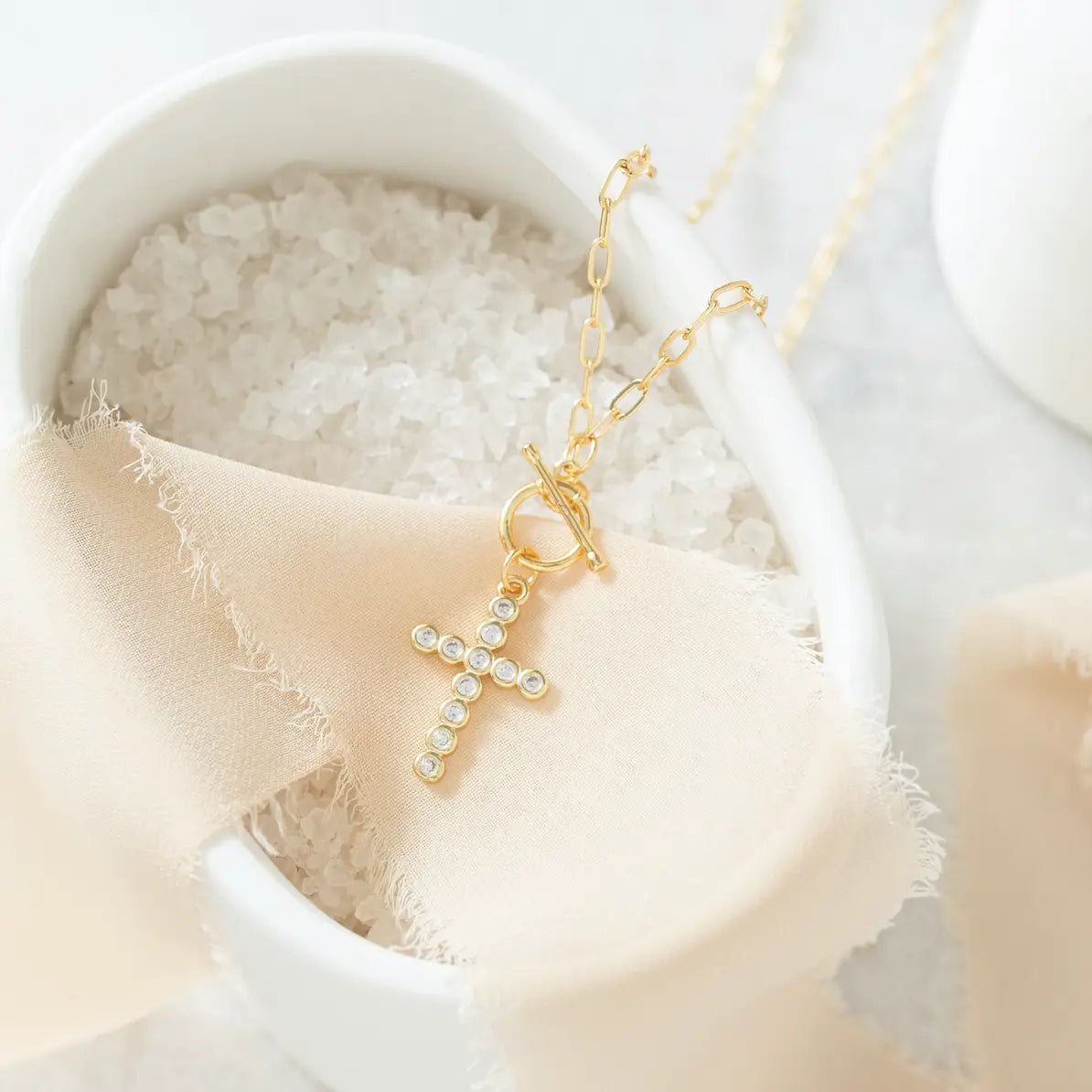 Delicate link chain with a shimmering CZ embellished cross, sporting a glam front toggle closure.