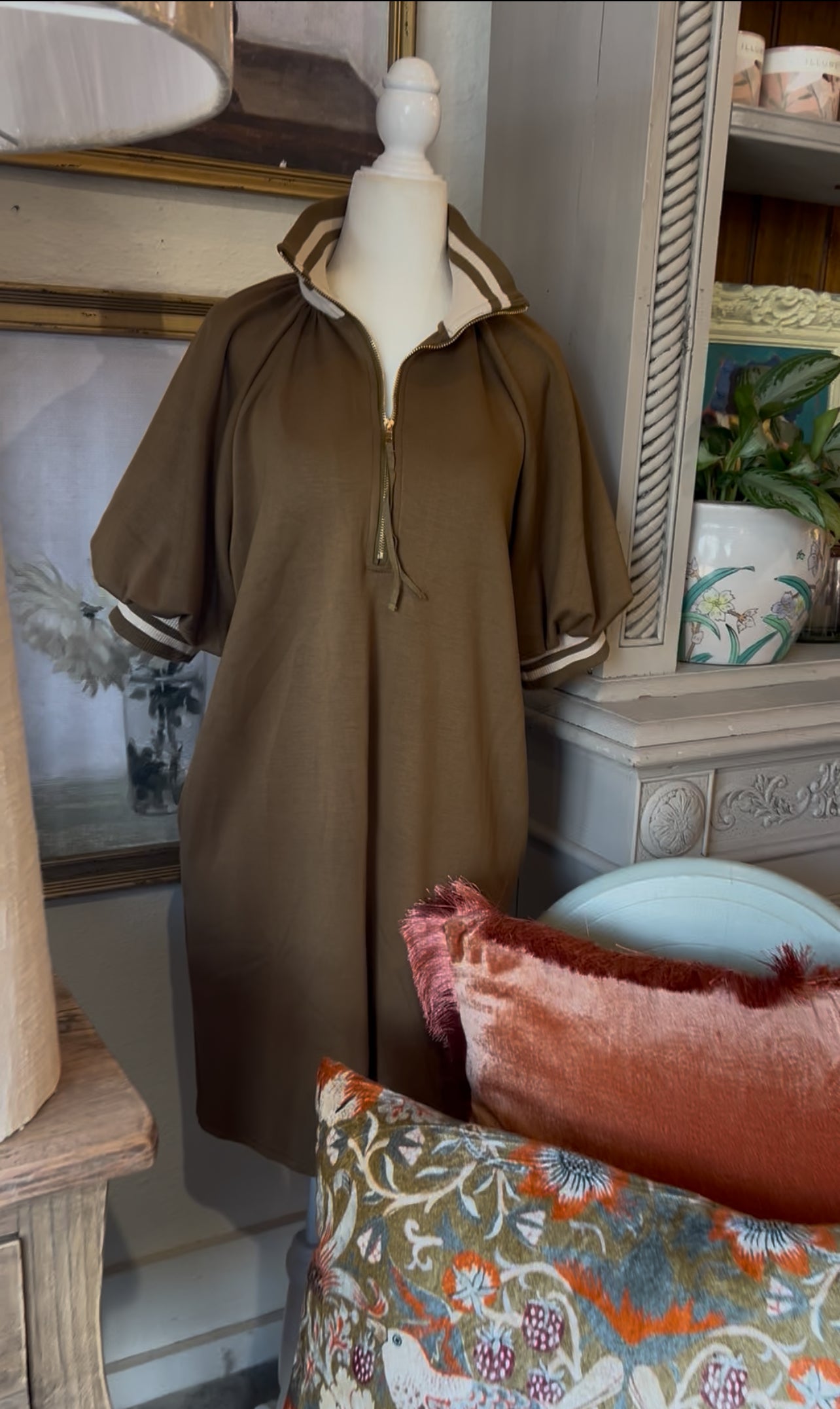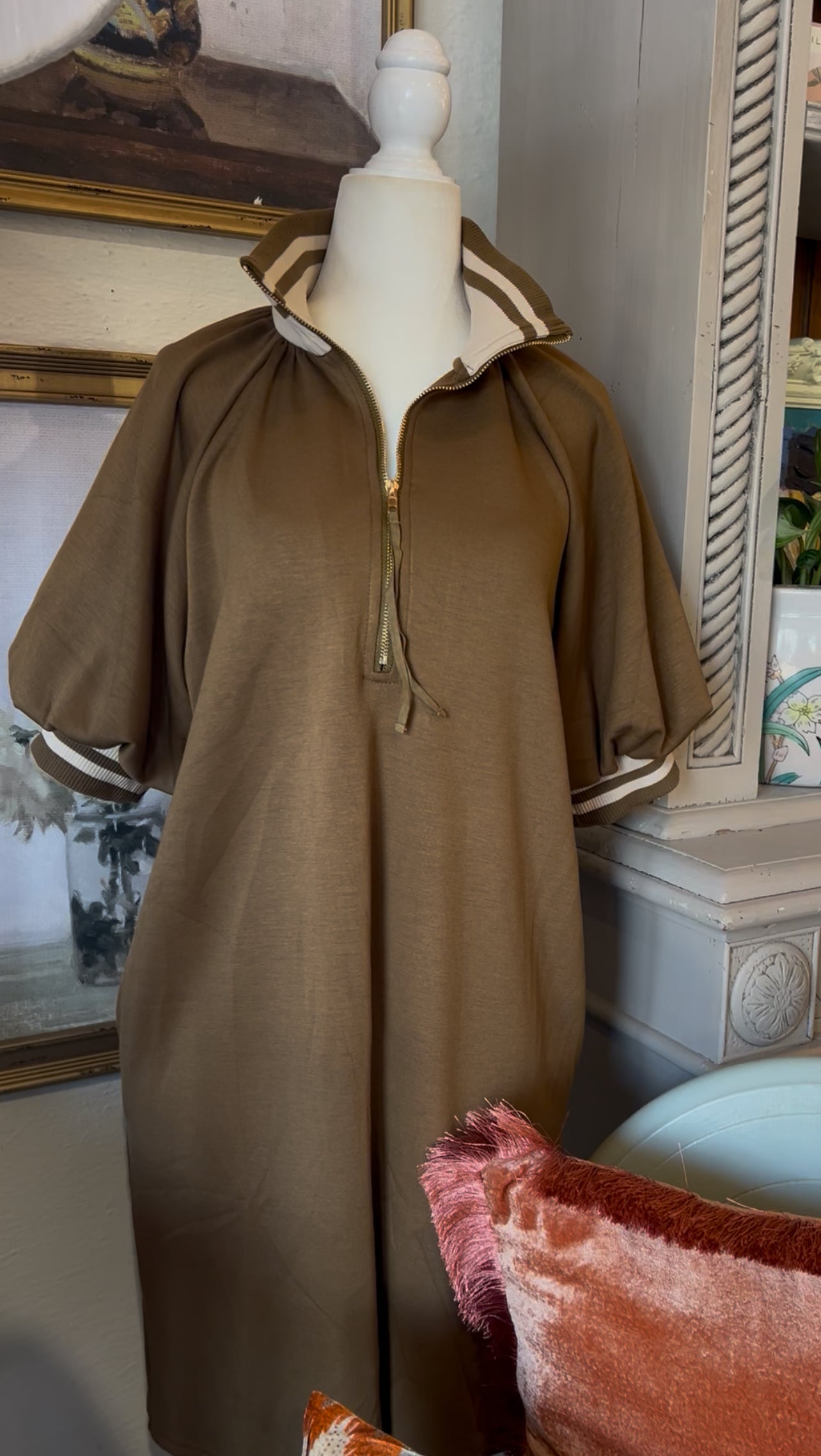 Adorable deep olive dress with thick sport collar and sleeve, with quarter zip neckline.