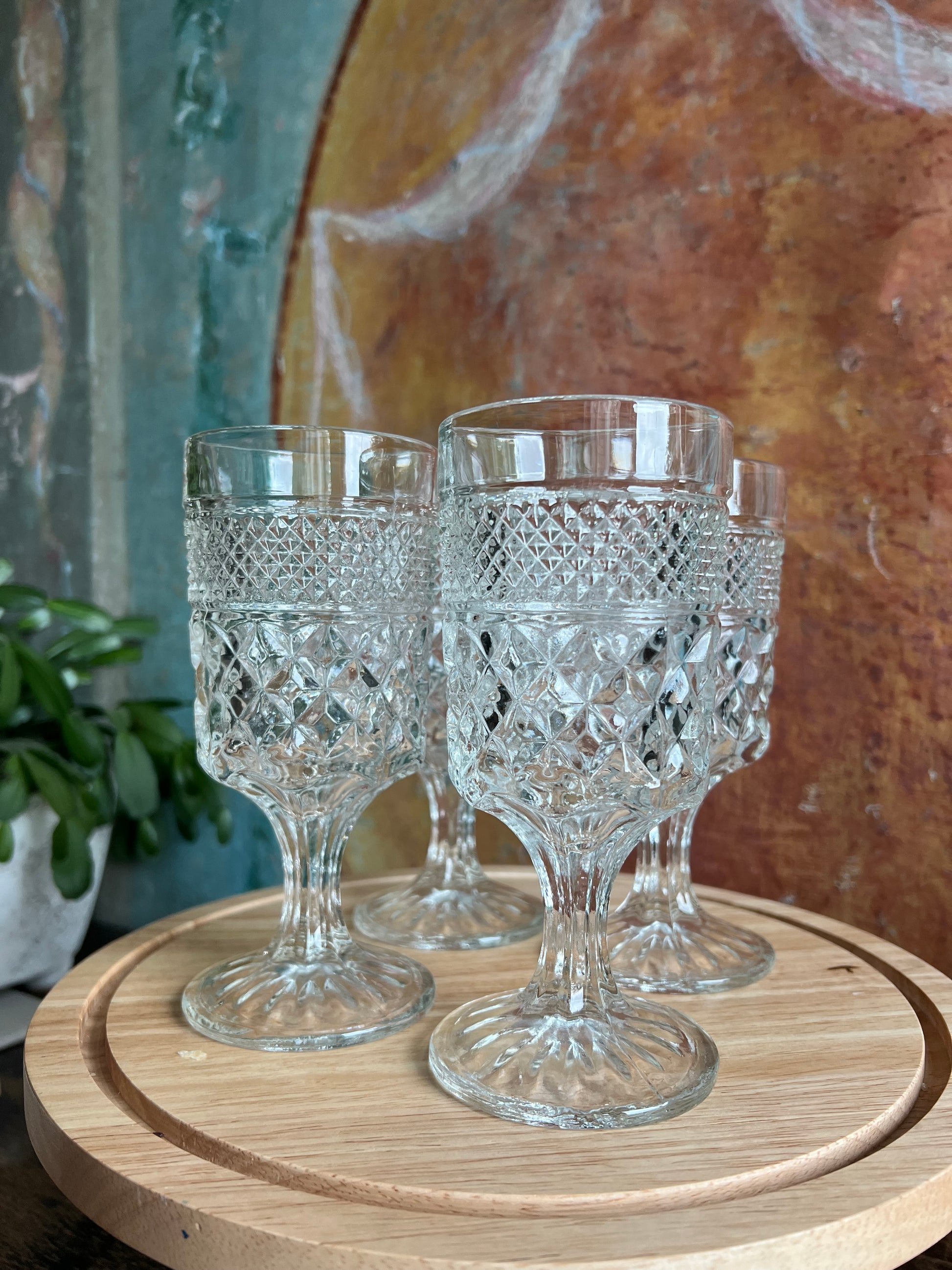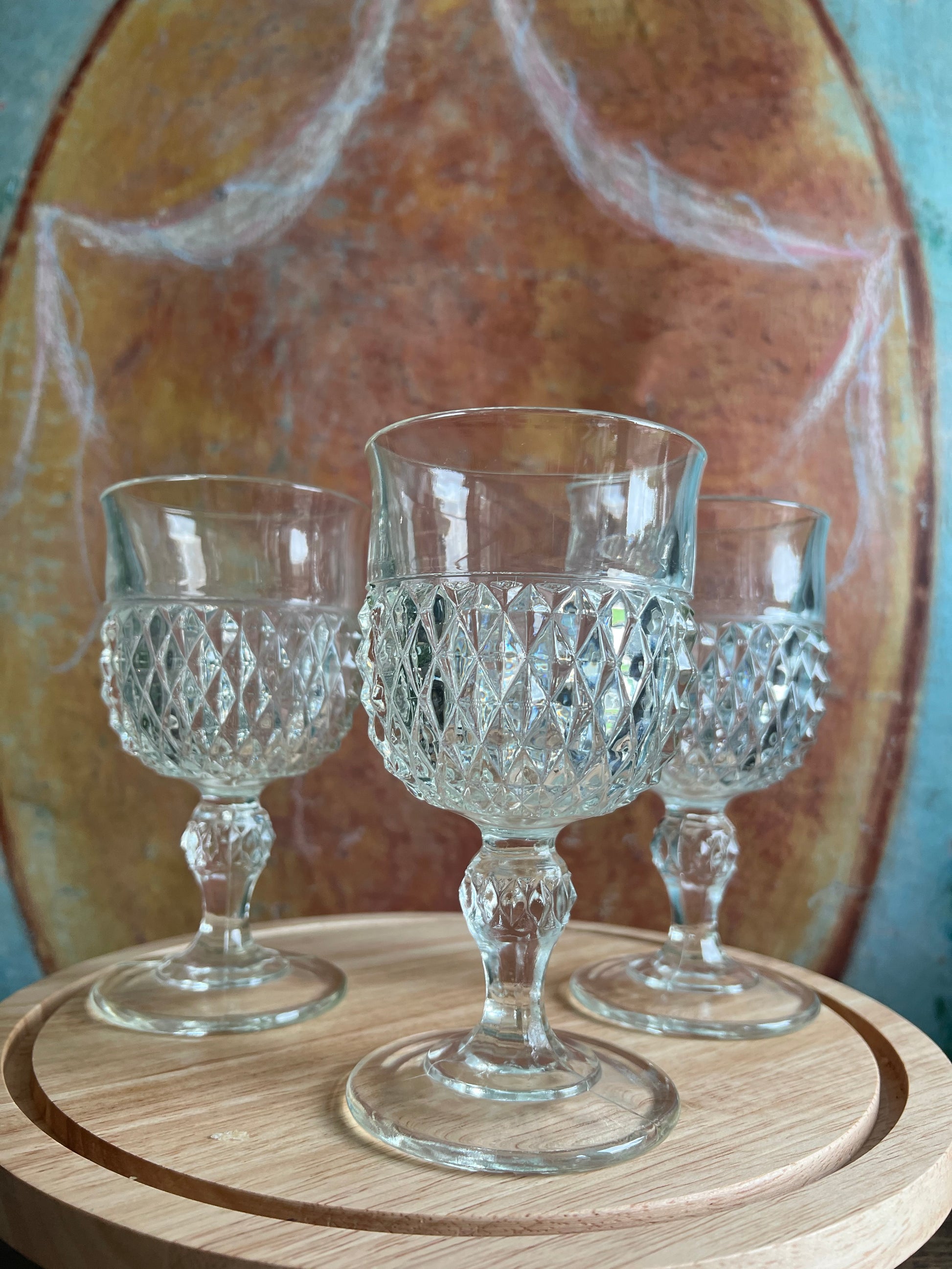 Vintage clear drinking glasses with diamond cut embellishment that reflects light for a really glamours look.