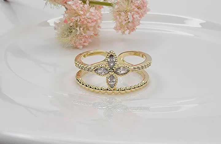 Two layer ring with floral accent. Adjustable sizing. Stunning cubic zirconia with gold plated brass.