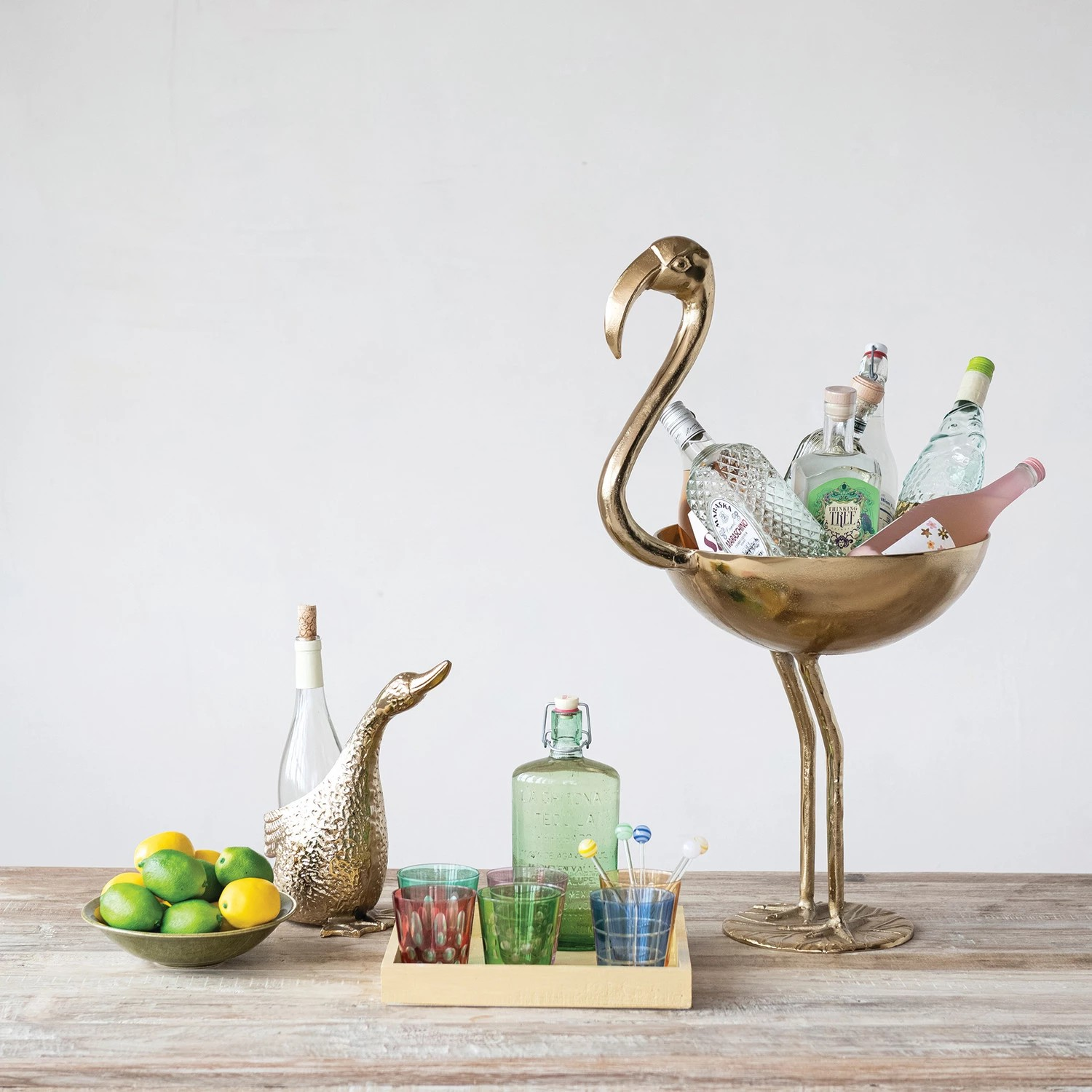 Duck shaped bottle holder made of cast aluminum in a gold finish.