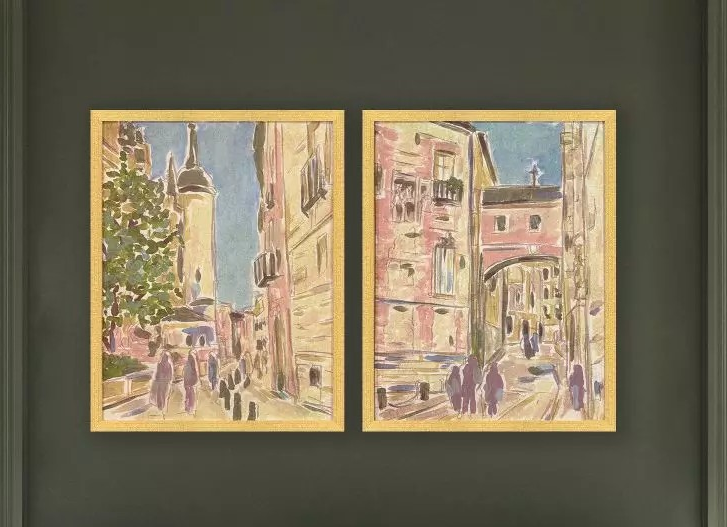 Charming European streets are reimagined with an unexpected twist in pastel colors. Framed in a burnished gold molding with textured distressing.