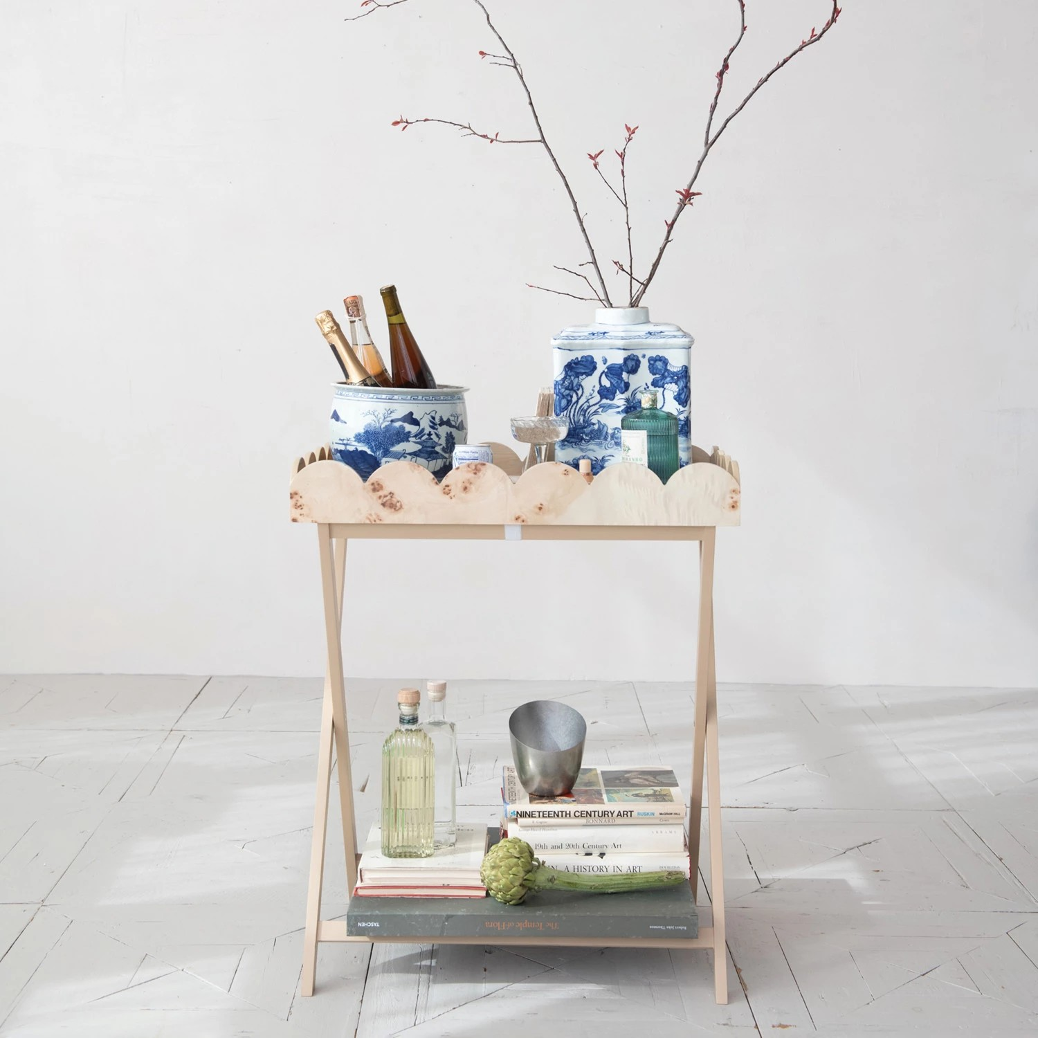 This gorgeous table is perfect for special events, holidays, or small spaces that need a little pazazz. This folding table is perfect for easy storage or transportation. The removable burlwood scalloped tray can be used individually or with the table. Layer on your coffee table, console, or use with this stand.