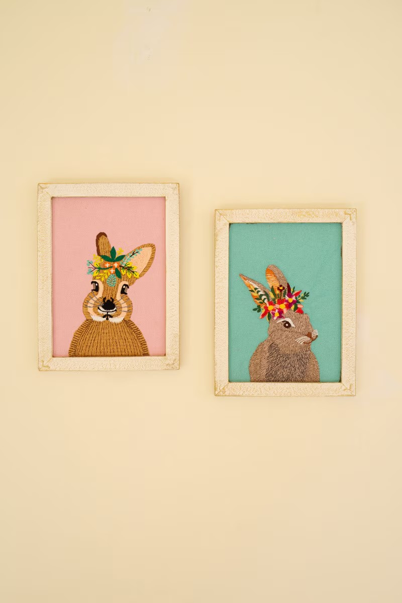 Adorable, embroidered rabbits in a wood frame.