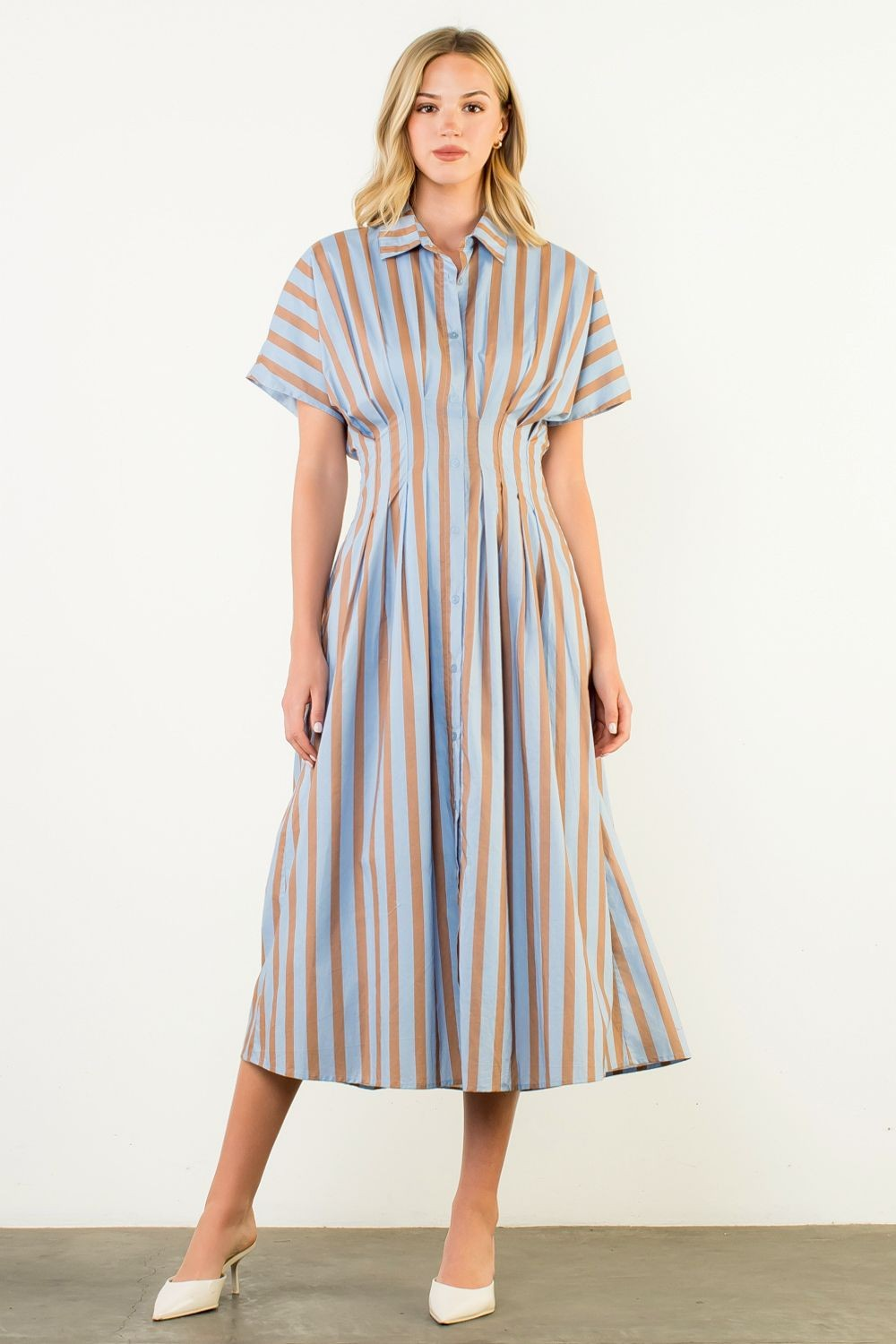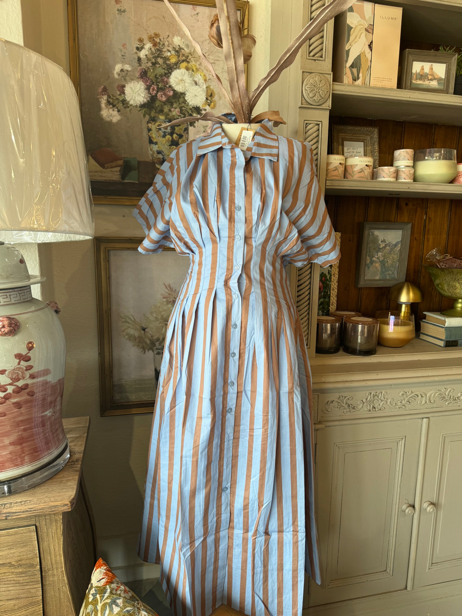 Gorgeous blue and tan stripe maxi with tapered waist, and button up front.