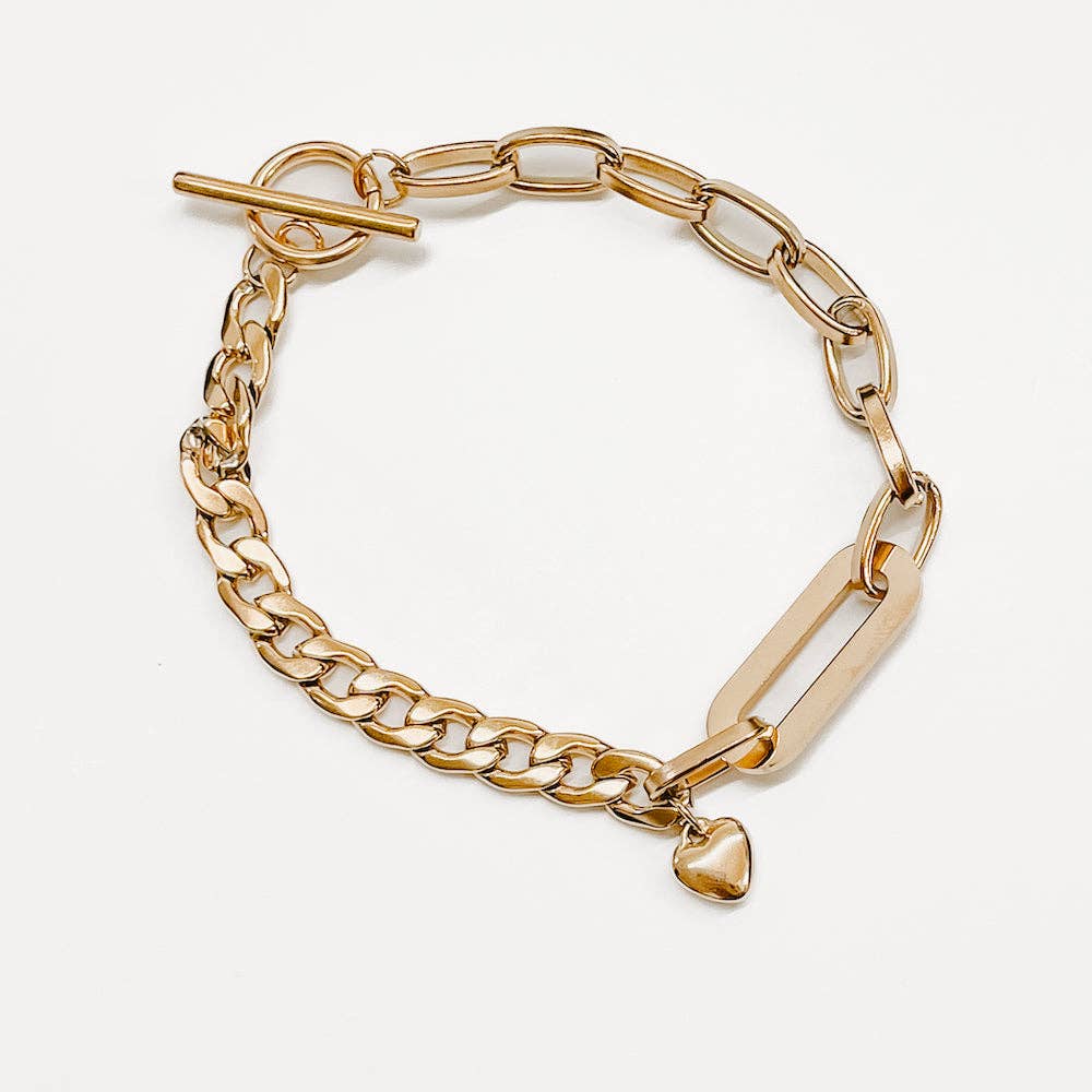 The stackable bracelet is perfect for layering or to wear solo. The toggle closure and the mix of chunky oval chains and geometric design adds some excitement to your wrist!