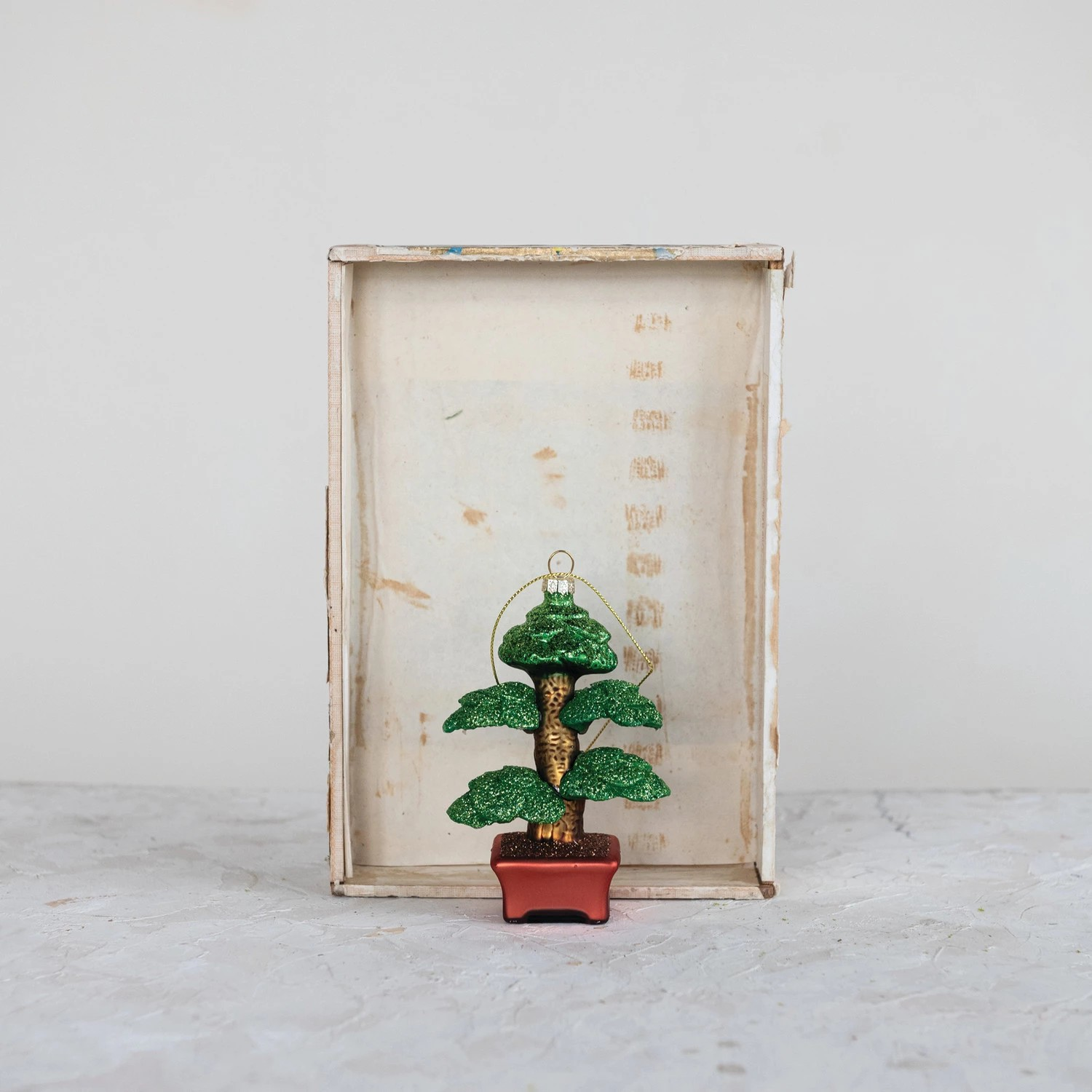 4.5" H Glass Bonsai Tree Ornament adorned with glitter in a rich green, brown & terra-cotta Color.