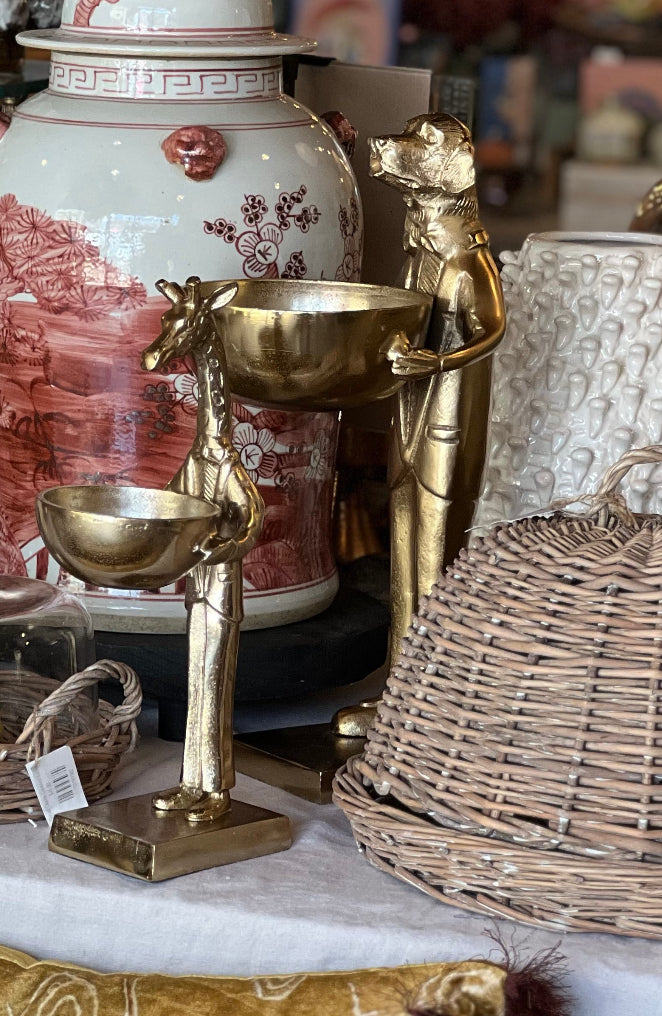 6"L x 4-1/2"W x 13"H Cast Aluminum Giraffe Holding Bowl, Gold Finish