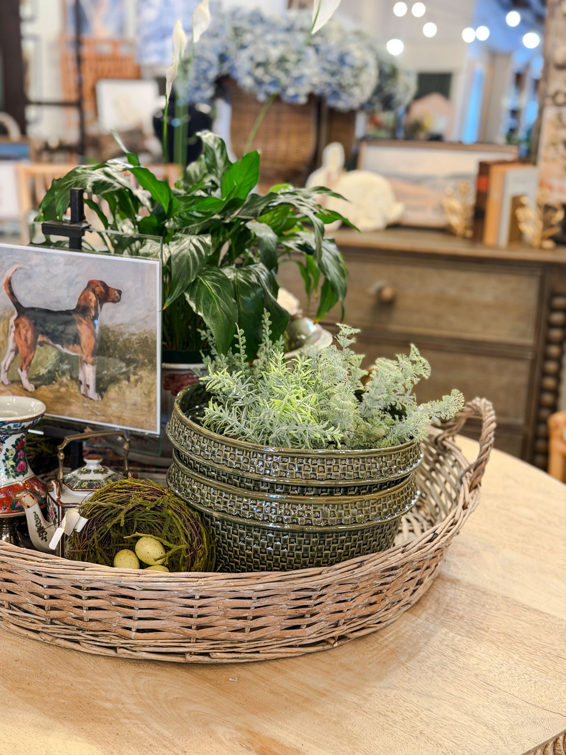 Stoneware Basket Weave Bowl, Reactive Glaze, Green