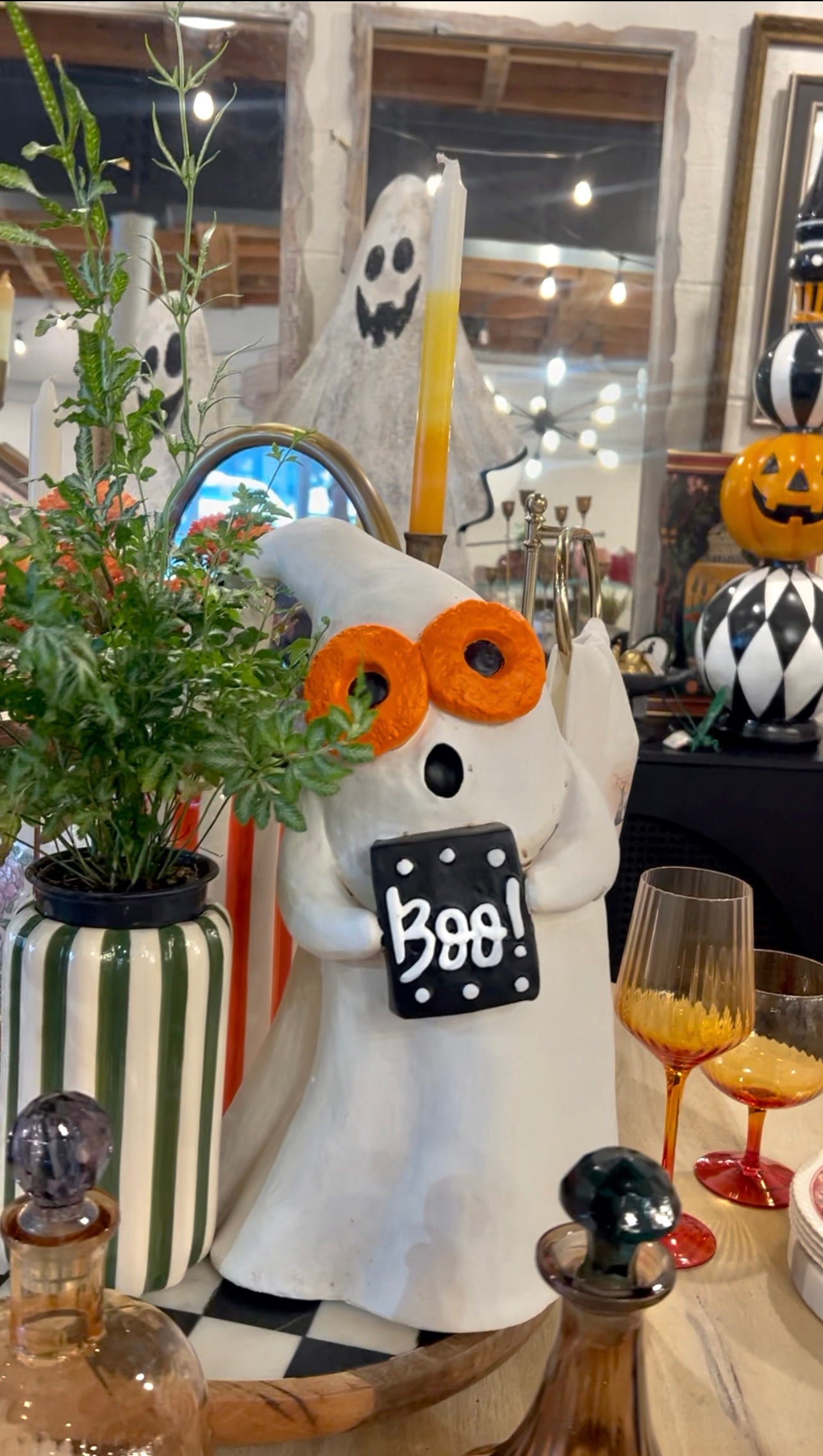 Dress up your decor with a resin Halloween ghosts. One with glasses holds a boo sign and the other wears a witch hat and holds a candy corn. Set these ghouls up to share a spooky thrill.