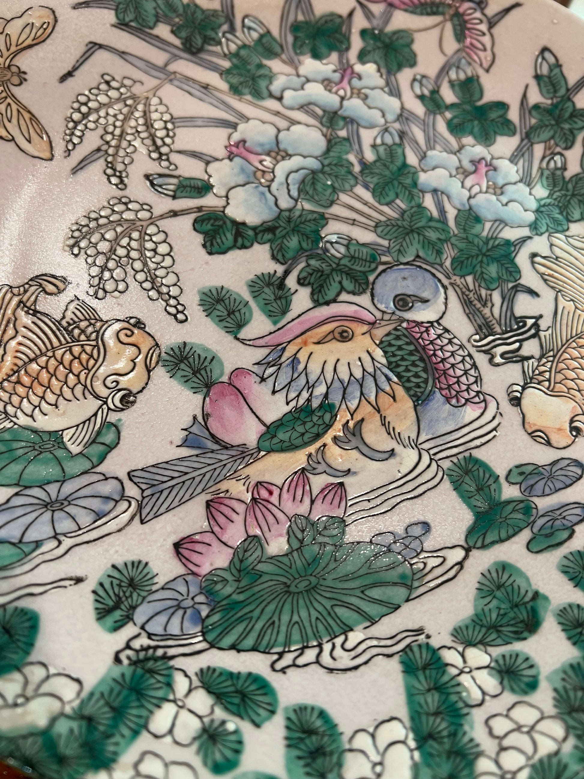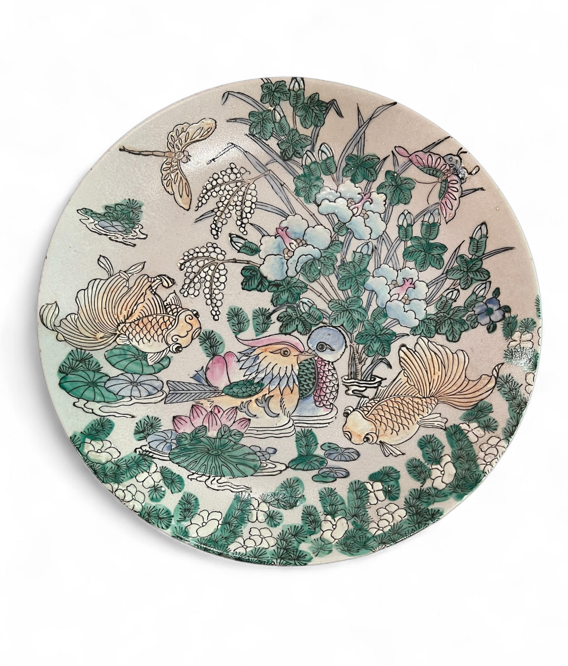 Macau Asian hand painted lotus and floral porcelain plate with beautiful garden scene featuring dragonflies, birds, and koi fish.