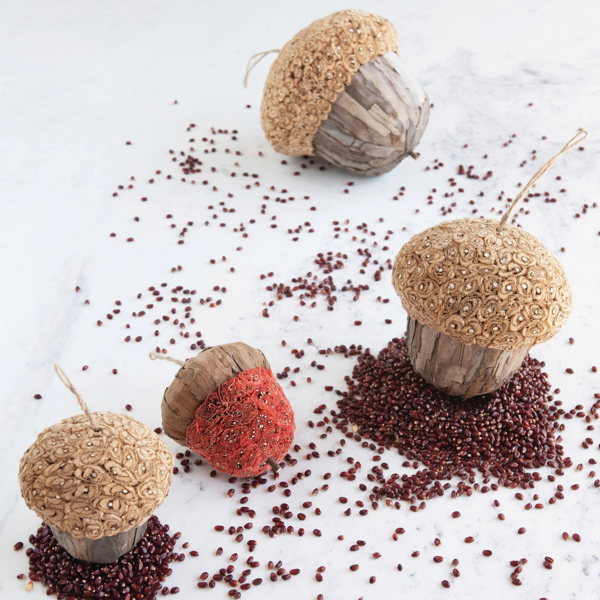 This 8" acorn ornament can be used for a stylish fall tablescape, or for a nature-inspired Christmas tree. Made out of jujube bark, this acorn ornament features a natural color that matches perfectly with the nature style. Can be used as a fall or Christmas decoration, and adds a pop of nature to any home.