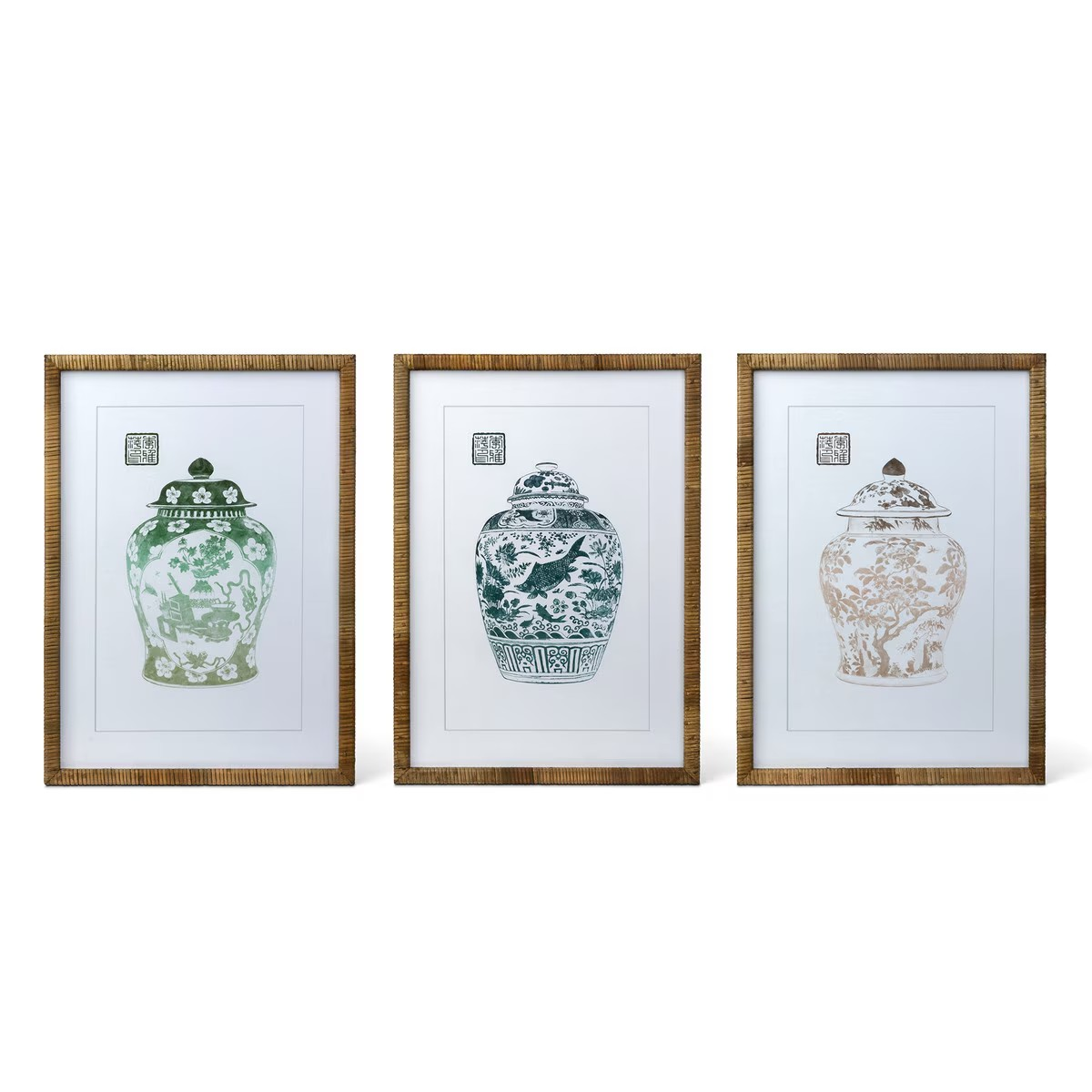 Add a touch of color and elegance to your space with our Lotus Framed Ginger Jar Picture. Featuring three beautifully framed prints in blush, indigo, and green, each jar exudes timeless charm and sophistication.