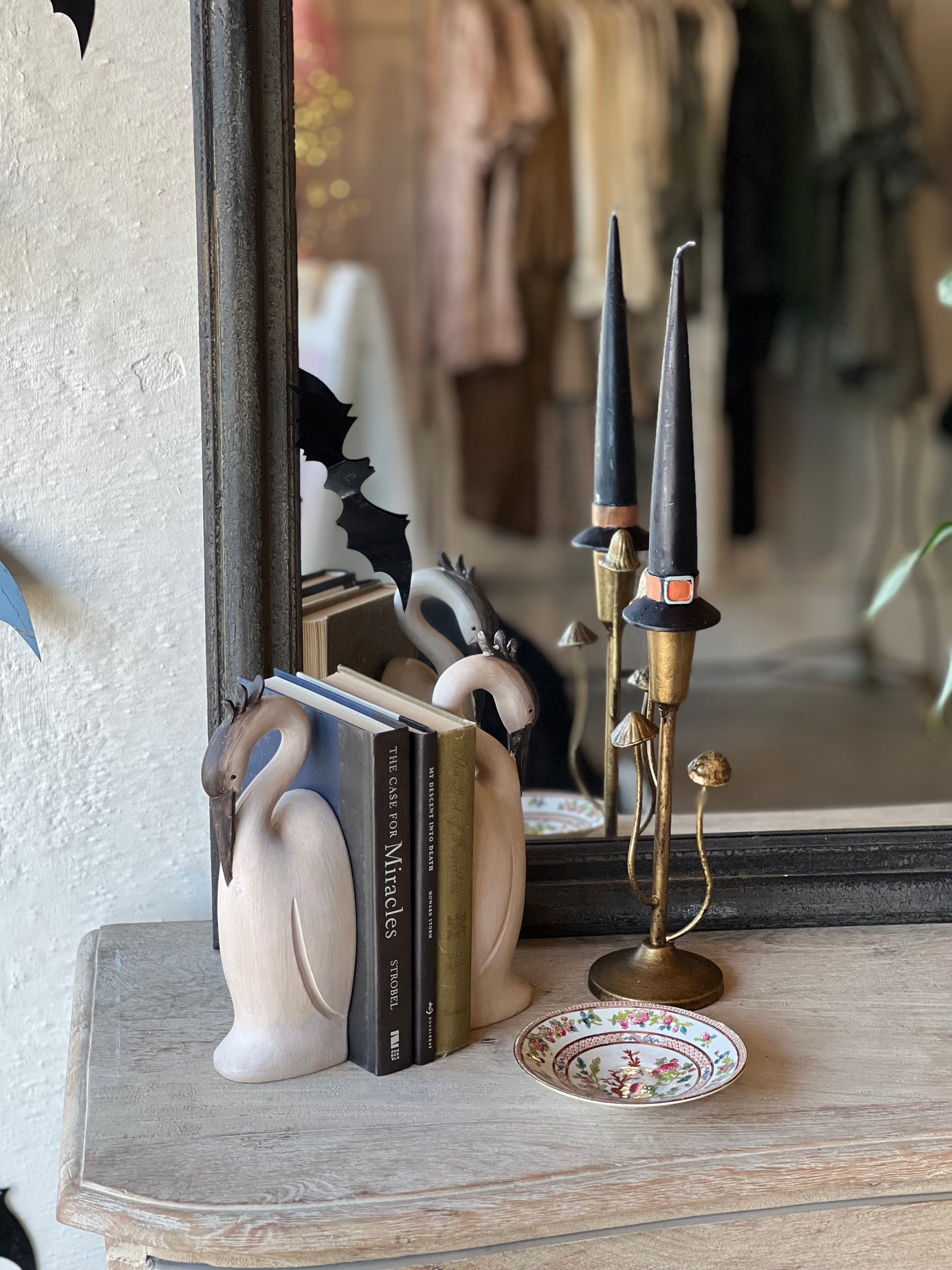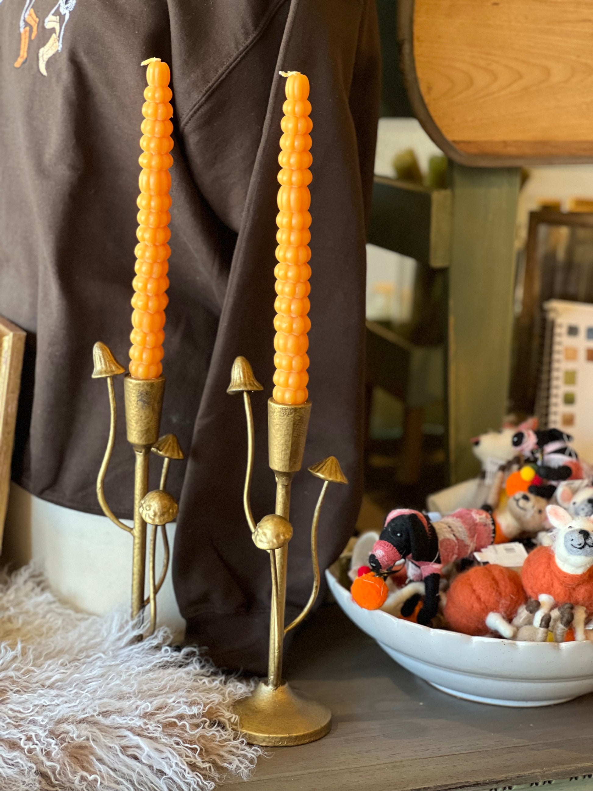 Vintage inspired tapers with mushrooms growing off the side in a beautiful antique gold finish.