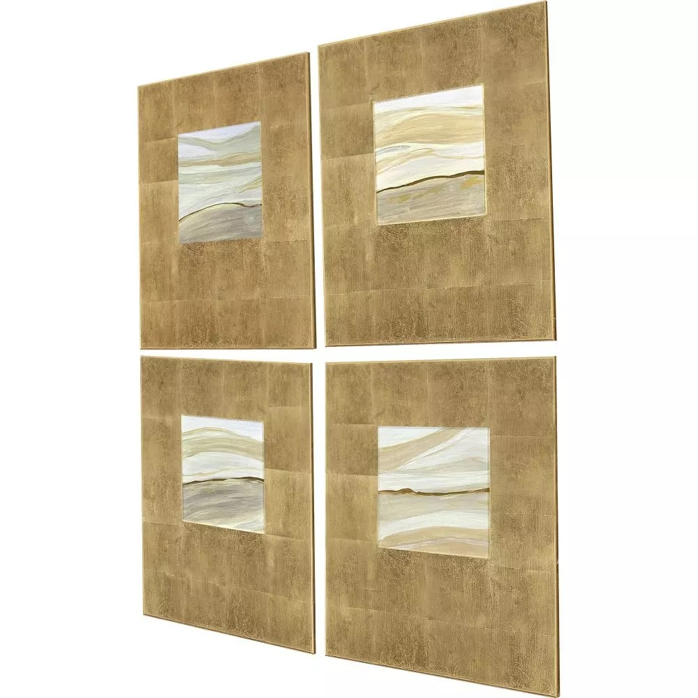 A series of exclusive hand painted neutral abstracts on wood offer subtle texture and tonal harmony with a handcrafted gold leaf wood surround.