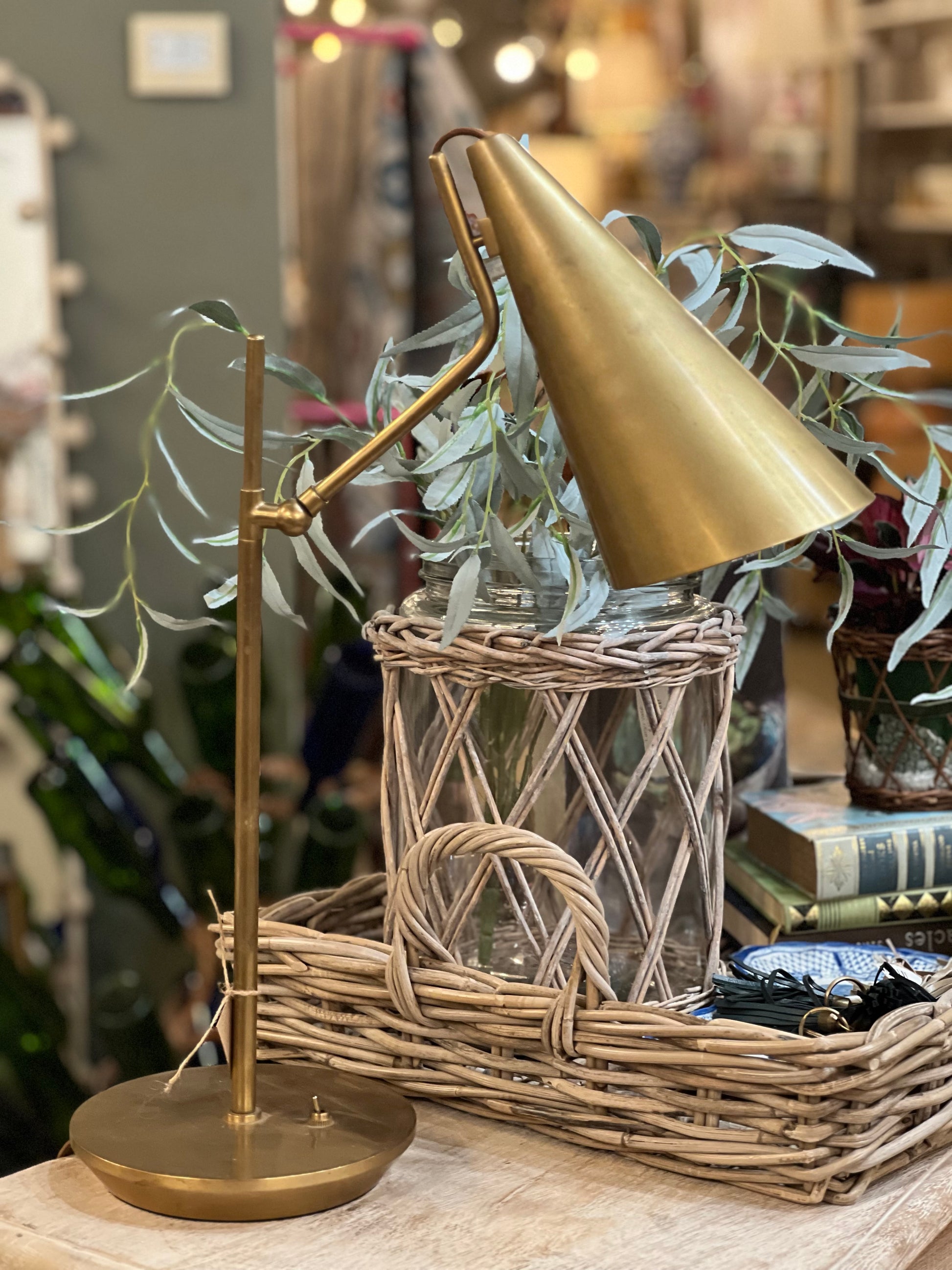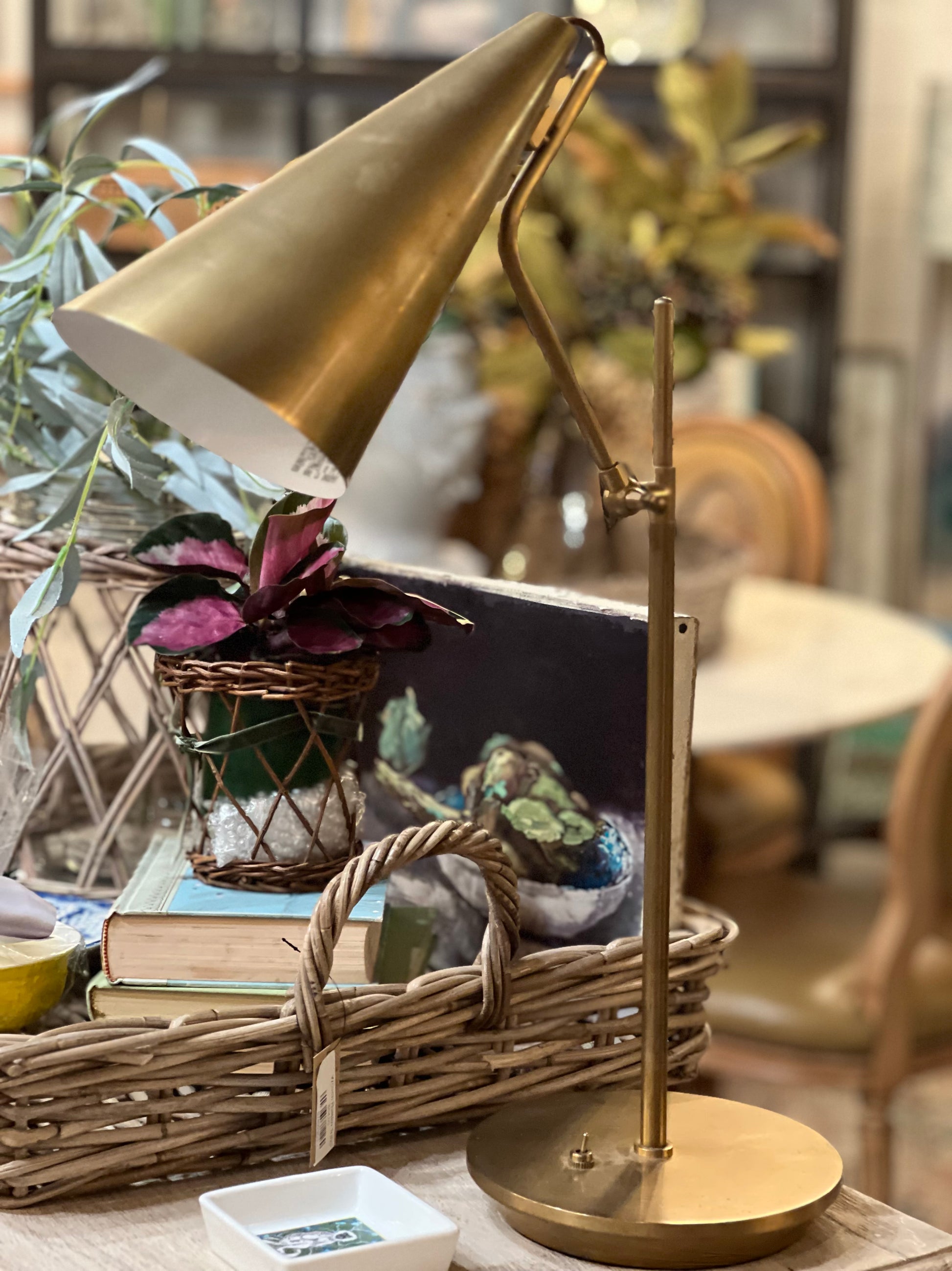 Striking MCM lamps, solid brass with adjustable neck/lever. Sold as a pair.