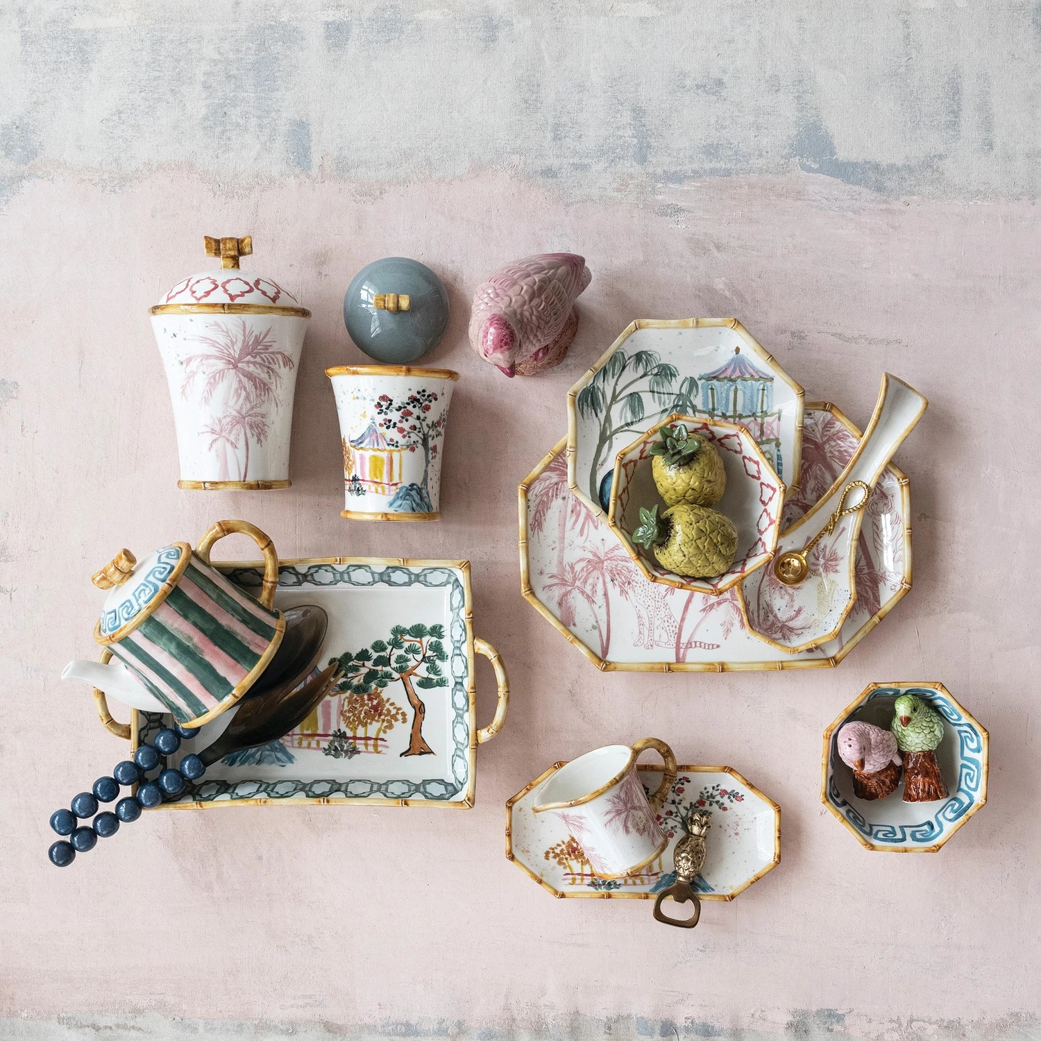 28 oz. Hand-Painted stoneware striped teapot with greek key top and bamboo style edges.