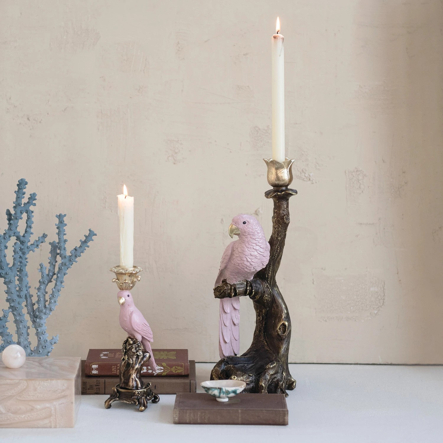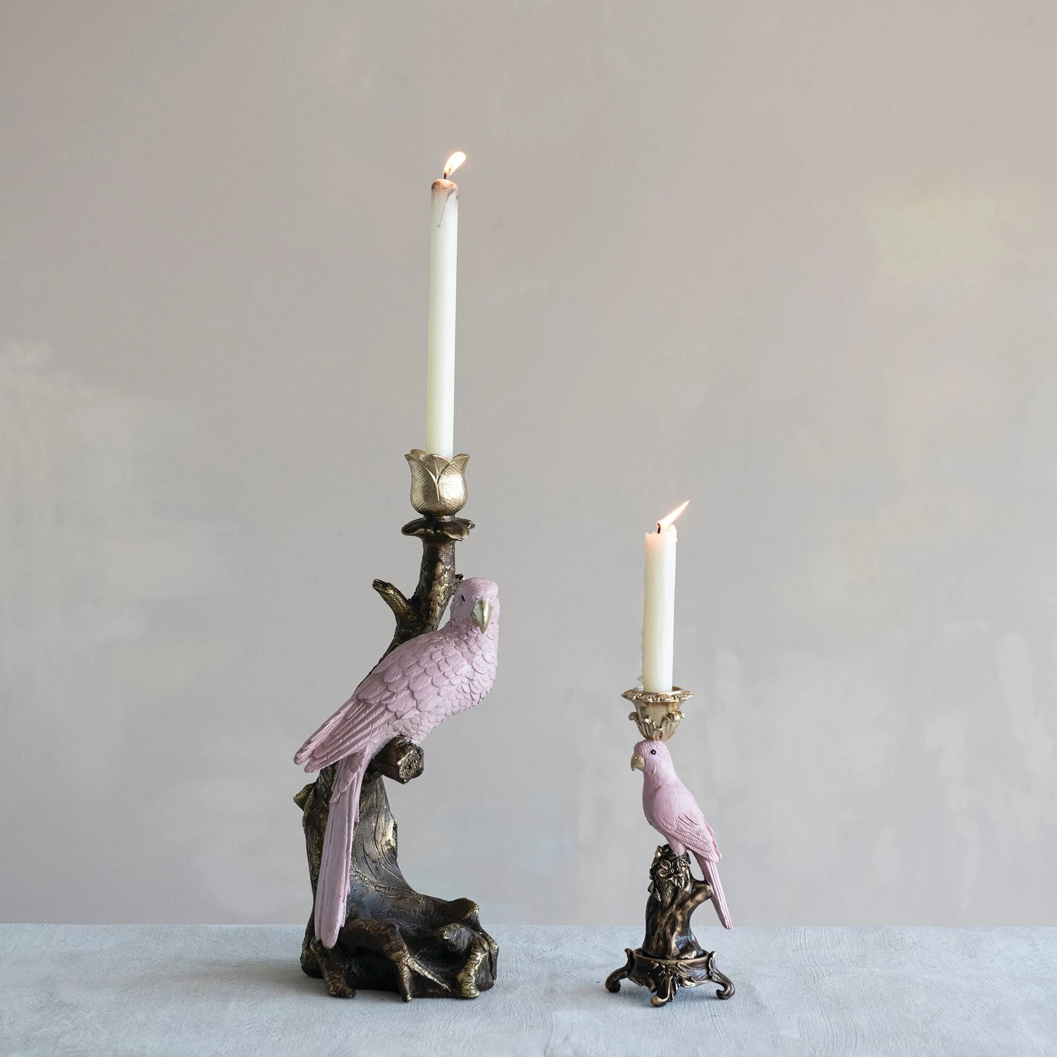 Resin Taper Holder with a Parrot on a Branch with Antique Pink and Gold Finish. Available in two sizes, sold individually.