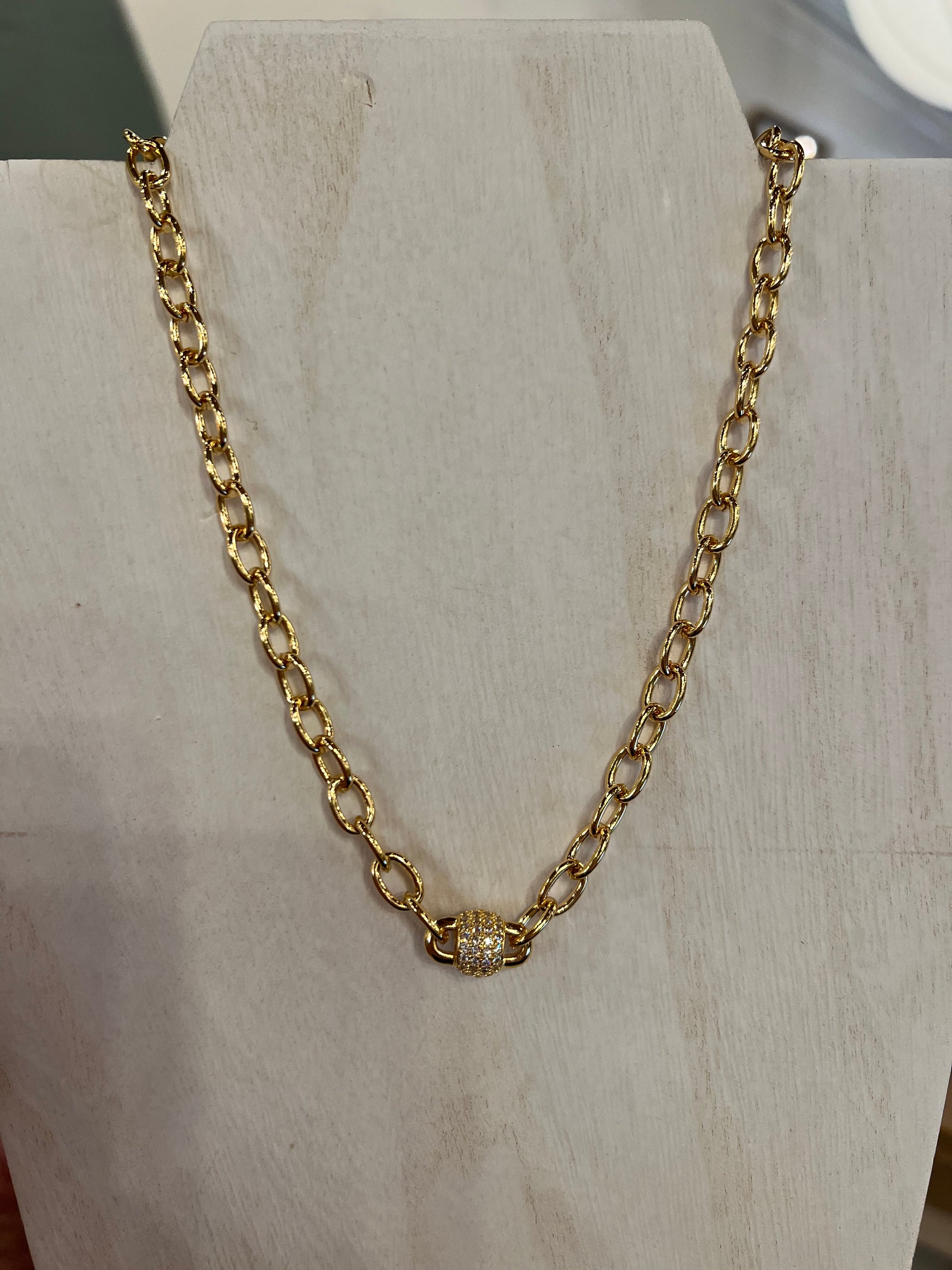 Petite gold chain with white clover pendant.