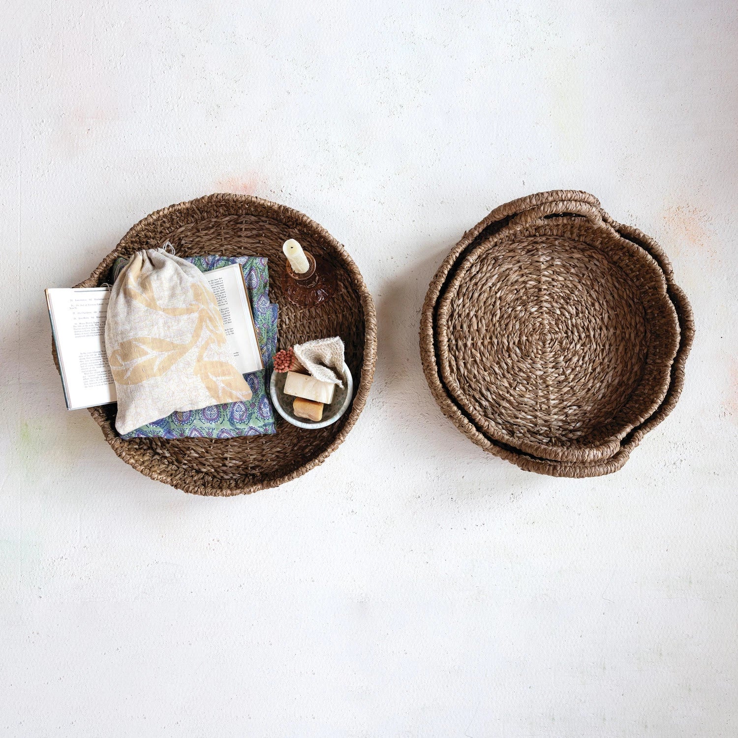Decorative scalloped rattan tray available in three sizes. These are perfect for accenting a coffee table, island, or dining table.