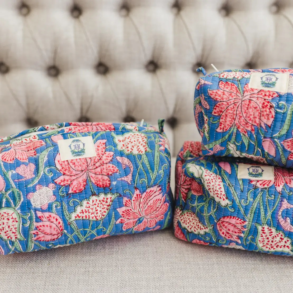 These beautiful hand quilted block print cosmetic bags make the perfect gift for you or a loved one. Each bag size includes inside pockets and are lined for easy cleanup! The block printing process may have variations in color, printing, and fabric as part of the handmade process which is what makes each product unique.
