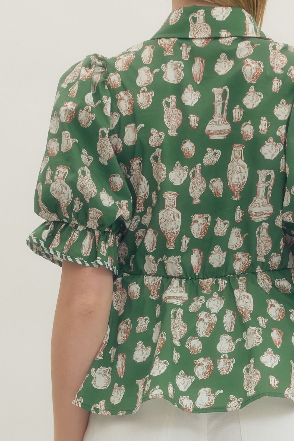 Adorable ginger jar button up shirt in striking green.
