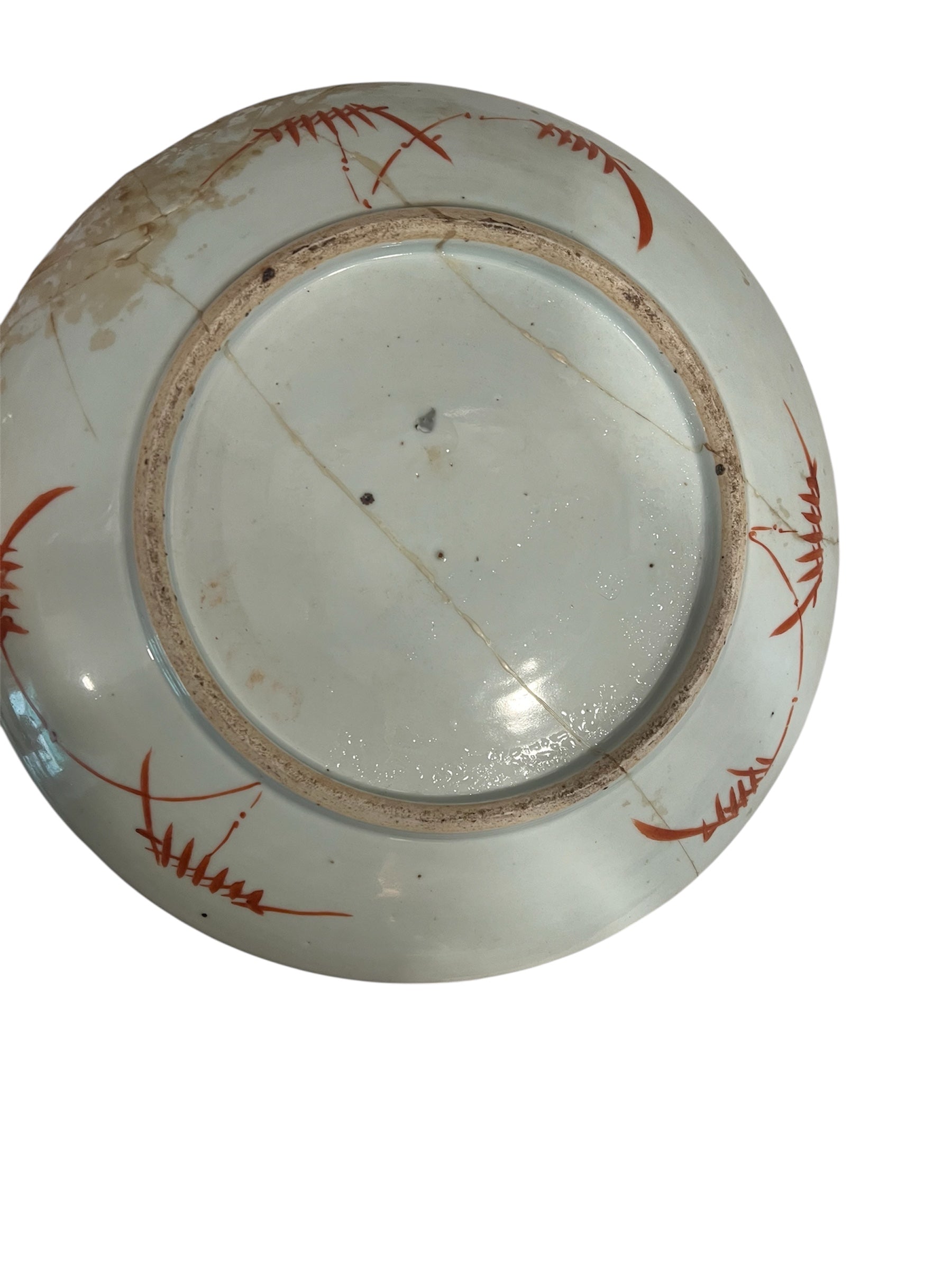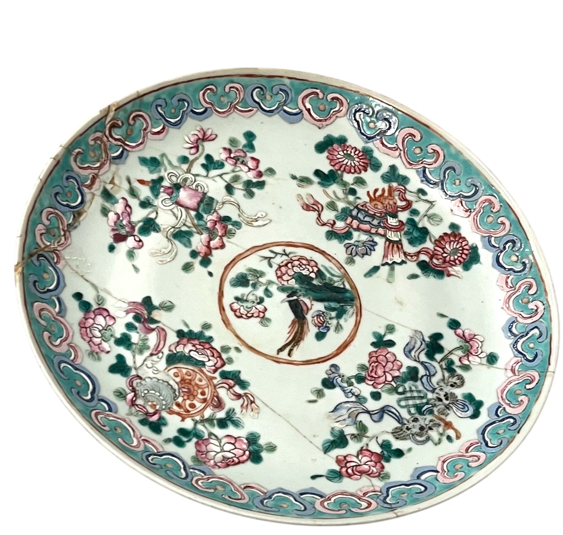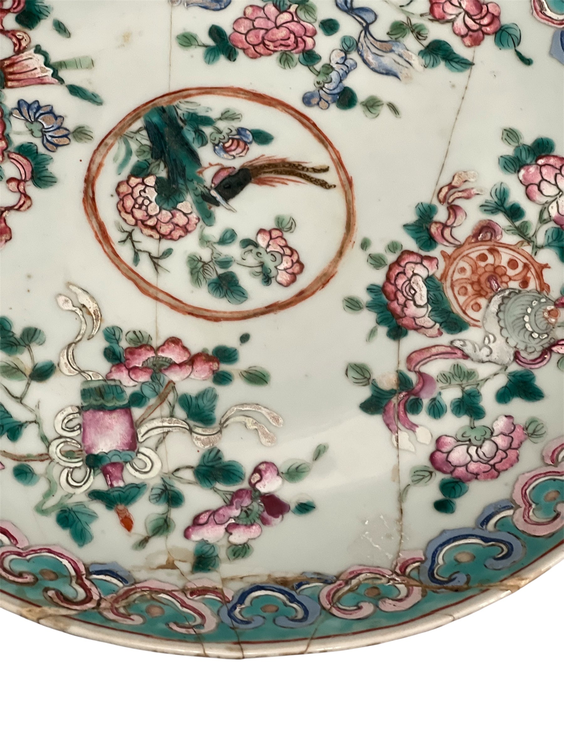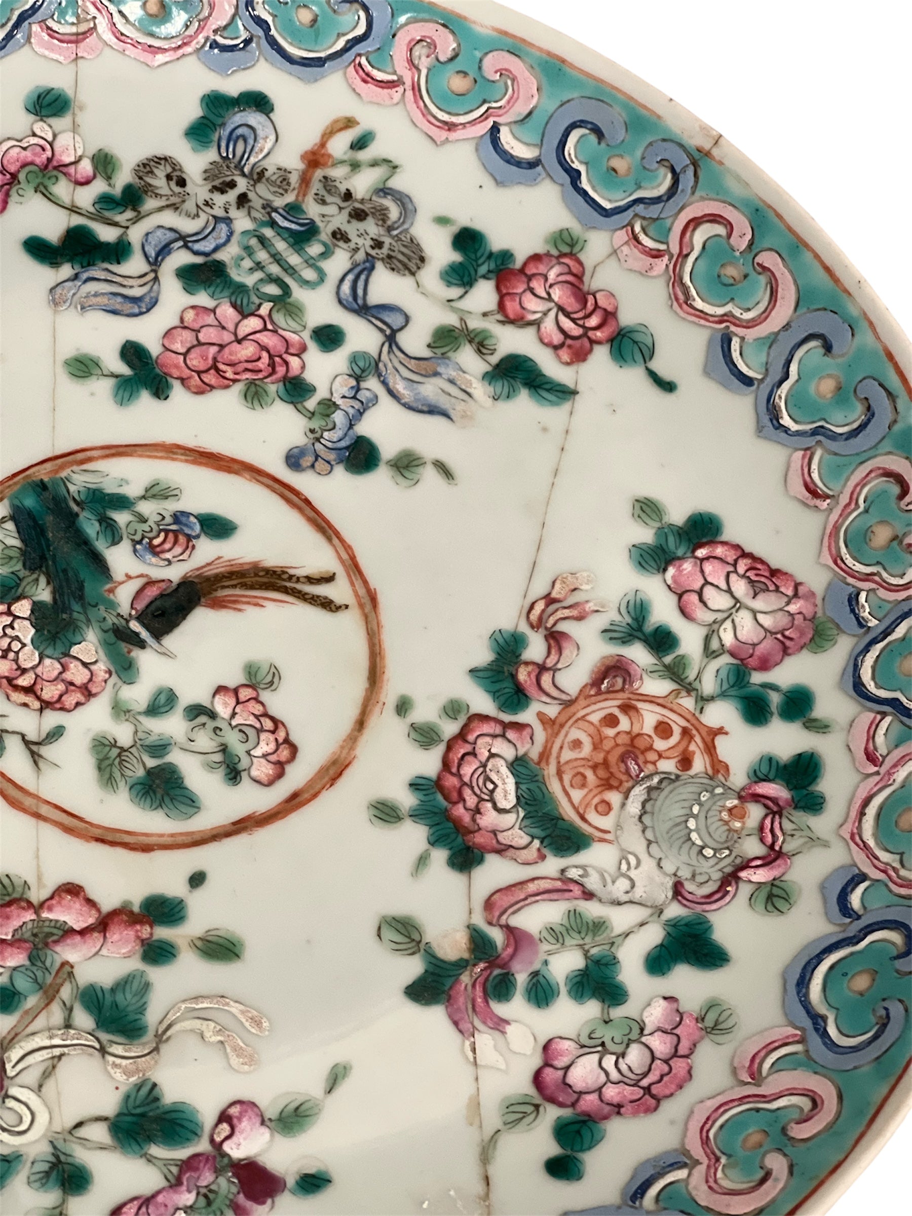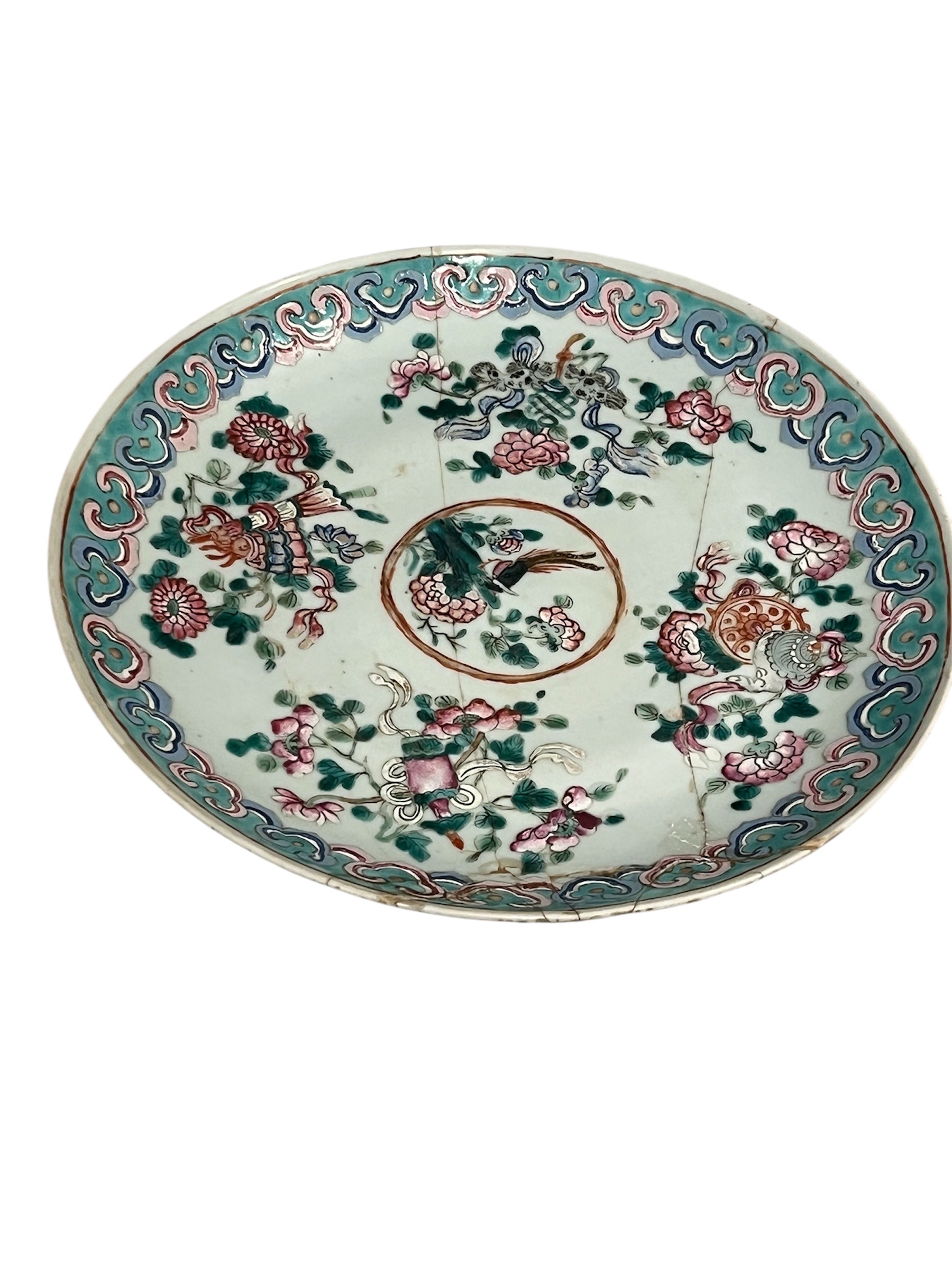 Stunning vintage Famille Rose plate with a stunning hand painted florals in blue, green, and pink. This plate is perfect for someone looking for the look without the collectors price tag. It has been broken and repaired in multiple places. However it would still look amazing on a bookshelf or wall display.